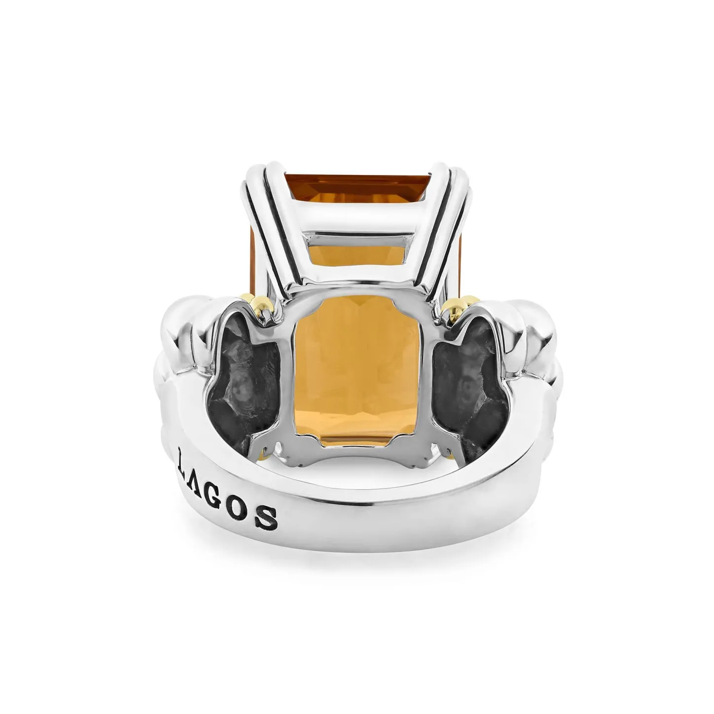 The Return Of A Lagos Icon. Our Signature Emerald-Cut Citrine Gemstone Ring With A Prong Setting In Sterling Silver And 18K Gold Caviar Beading.