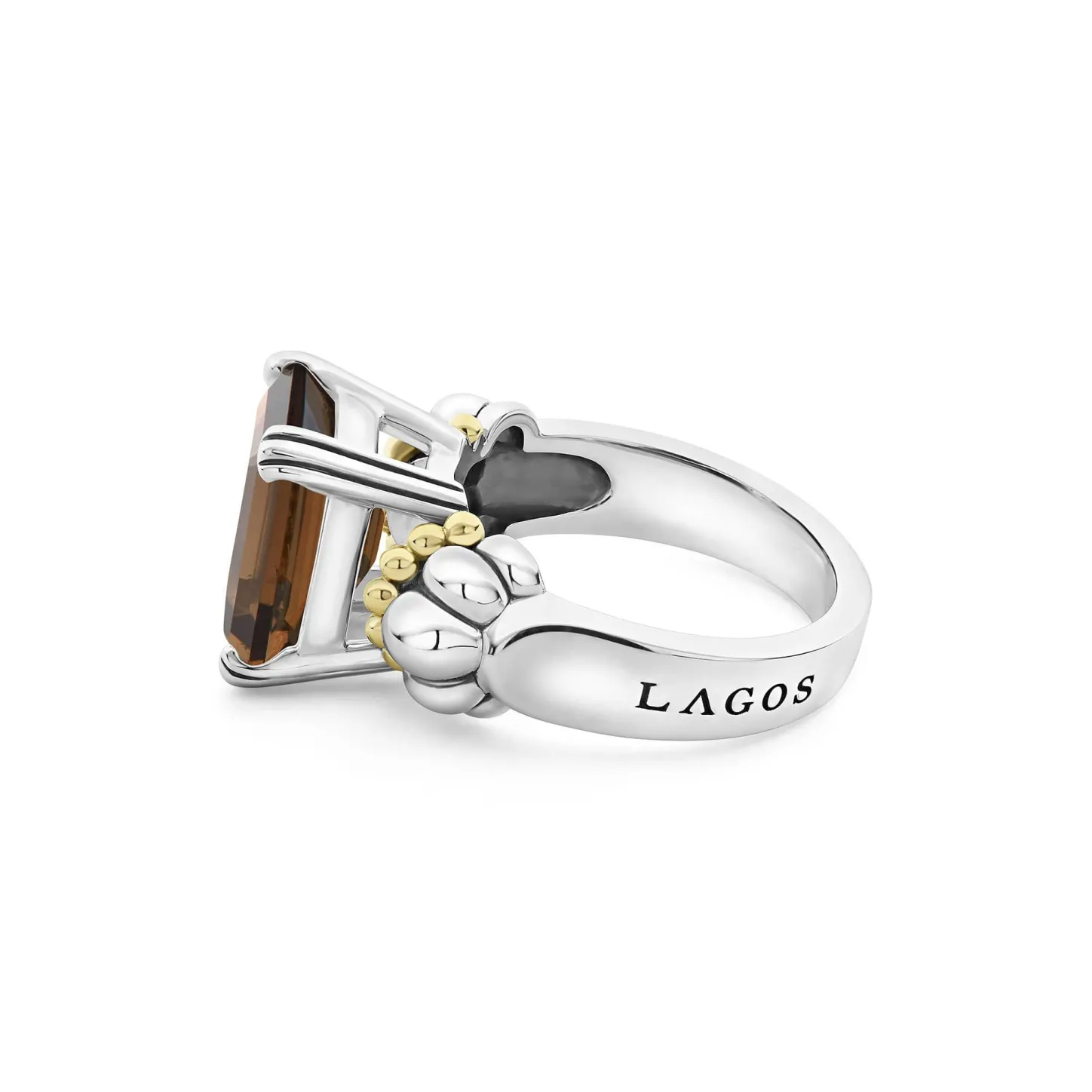 The Return Of A Lagos Icon. Our Signature Emerald-Cut Smokey Quartz Gemstone Ring With A Prong Setting In Sterling Silver And 18K Gold Caviar Beading.