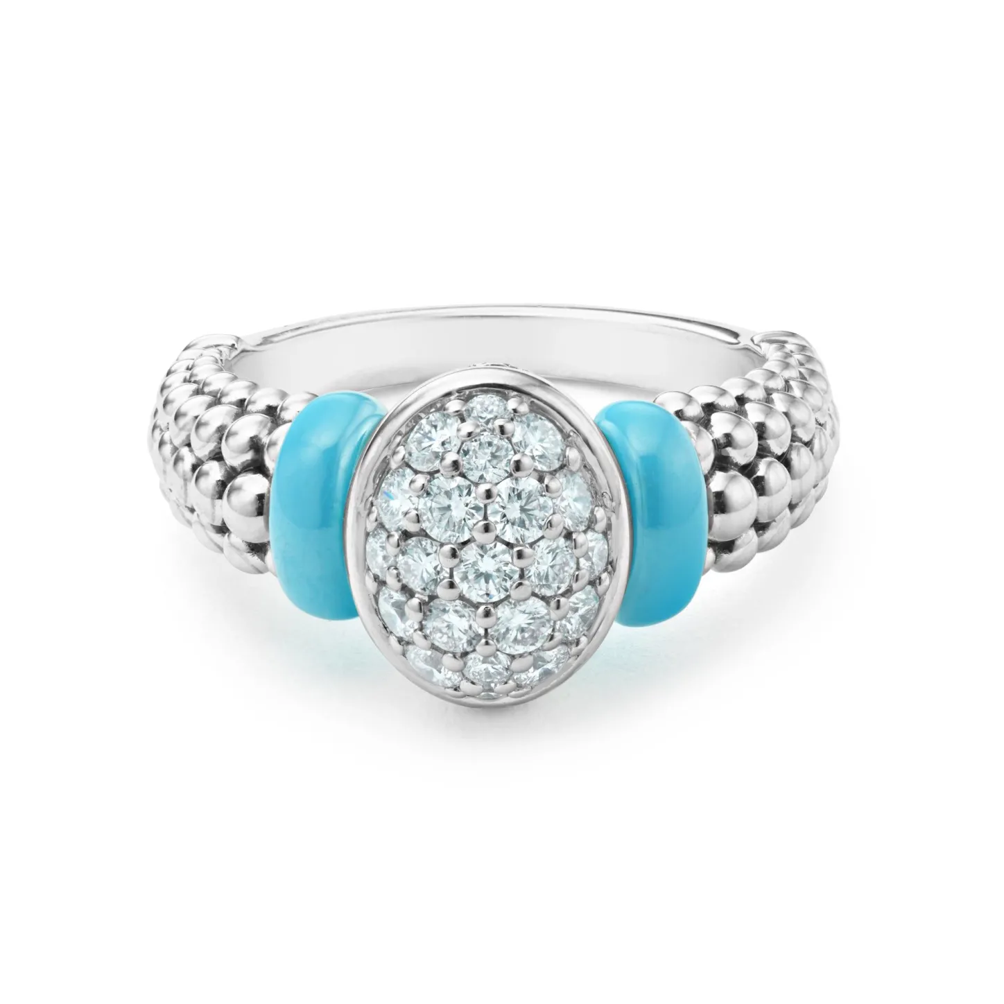 Diamonds Set In Sterling Silver Are Accented By Sleek Blue Ceramic And Caviar Beading On This Ring. Lagos Diamonds Are The Highest Quality Natural Stones.