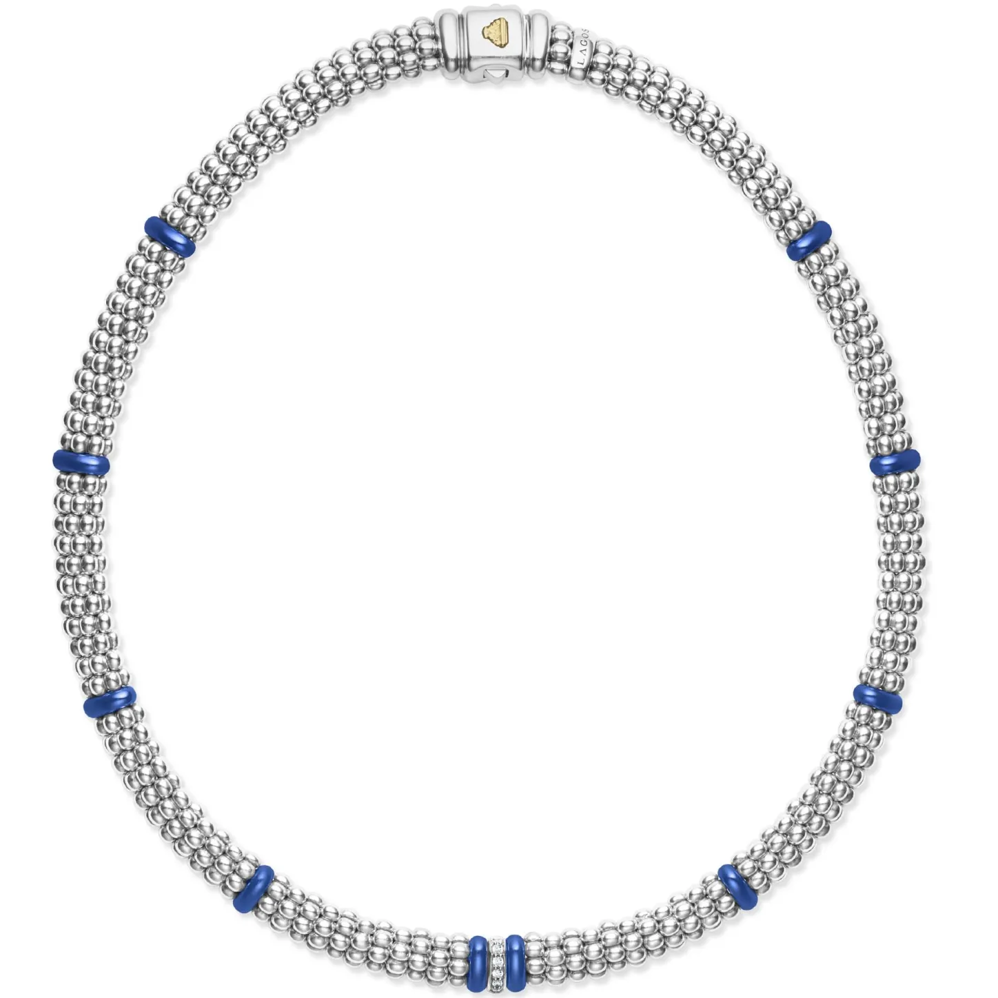 One Diamond Station Set In Sterling Silver Surrounded By Ten Ultramarine Ceramic Stations With Sterling Silver Caviar Beading. Lagos Diamonds Are The Highest Quality Natural Stones.