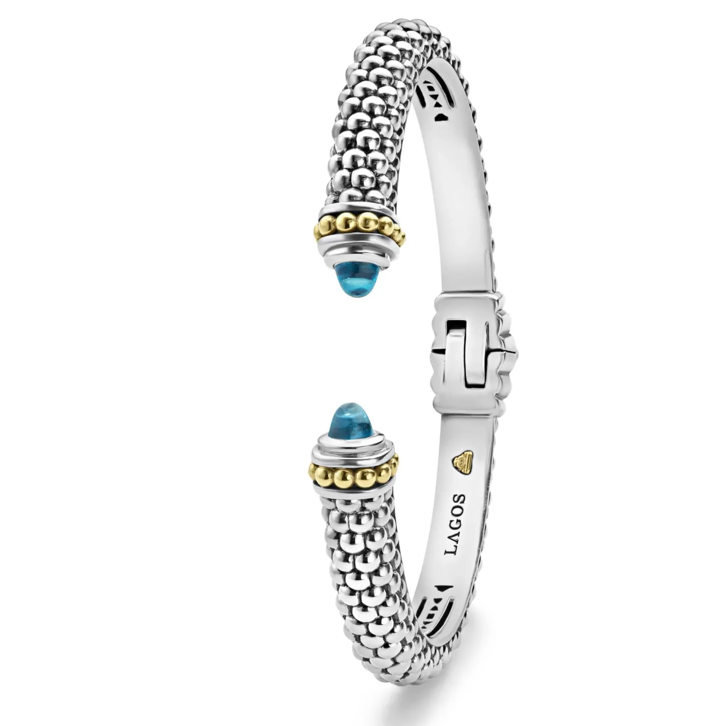 Caviar Beading And Highly Polished Sterling Silver Stations Comprise This Innovative Cuff Bracelet Detailing Swiss Blue Topaz Gemstone End Caps.