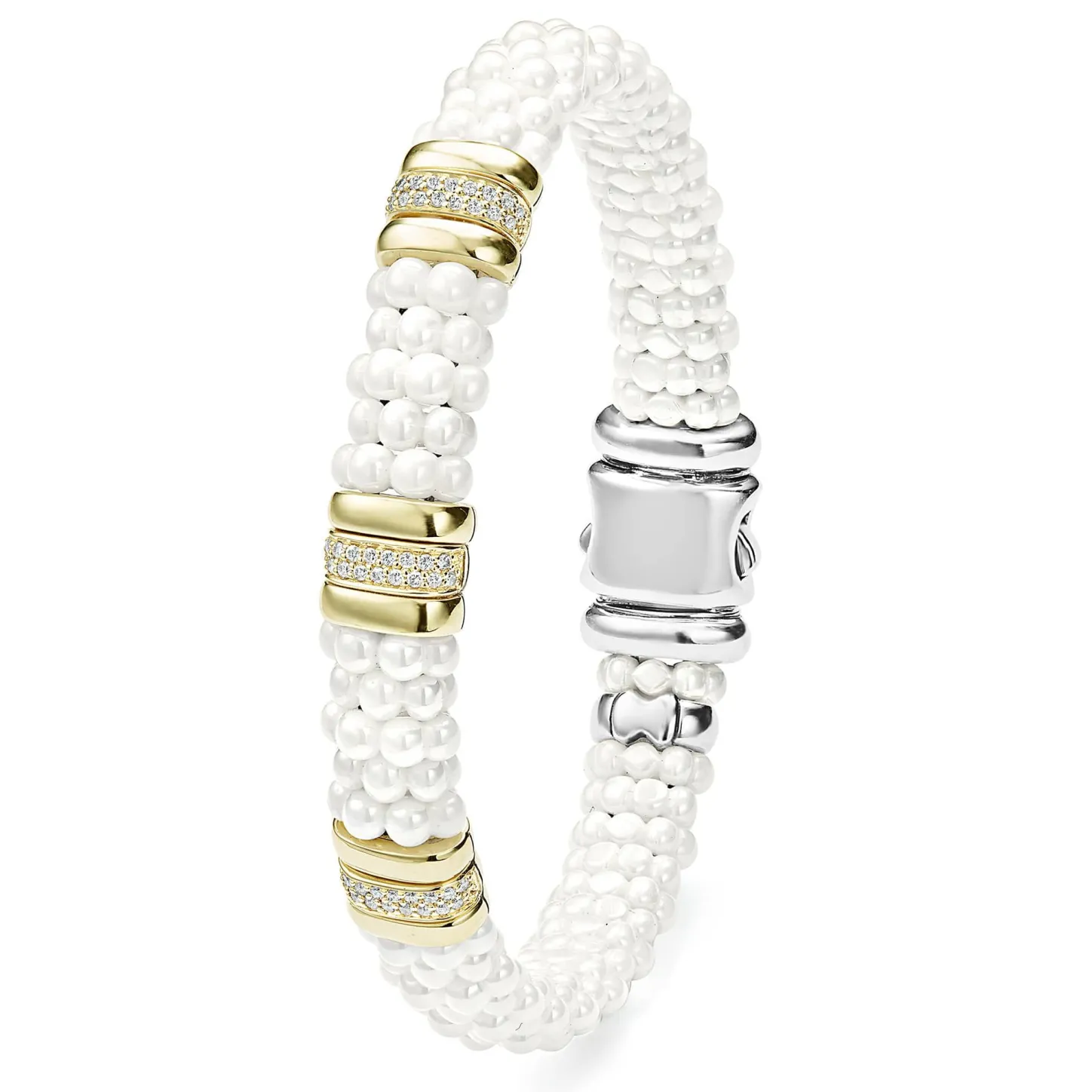 White Caviar Beaded Ceramic Bracelet With 18K Gold And Three Diamond Stations.