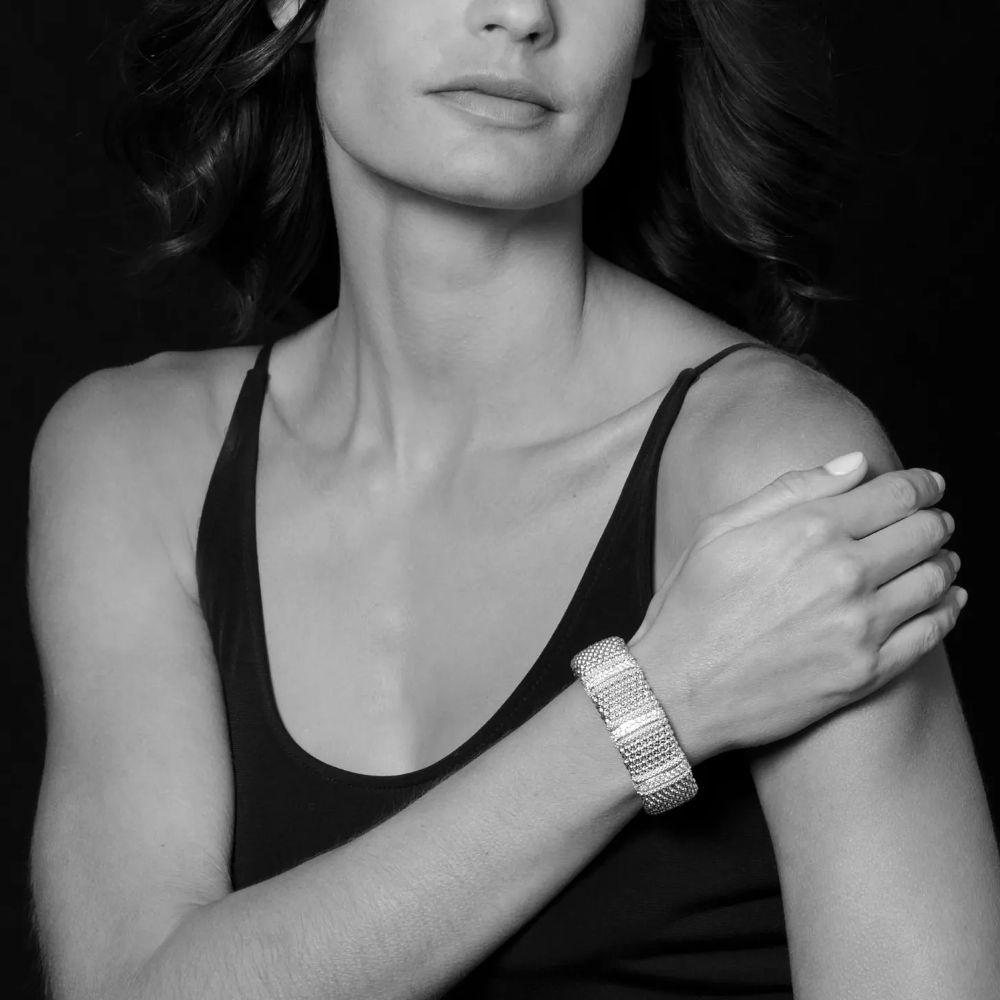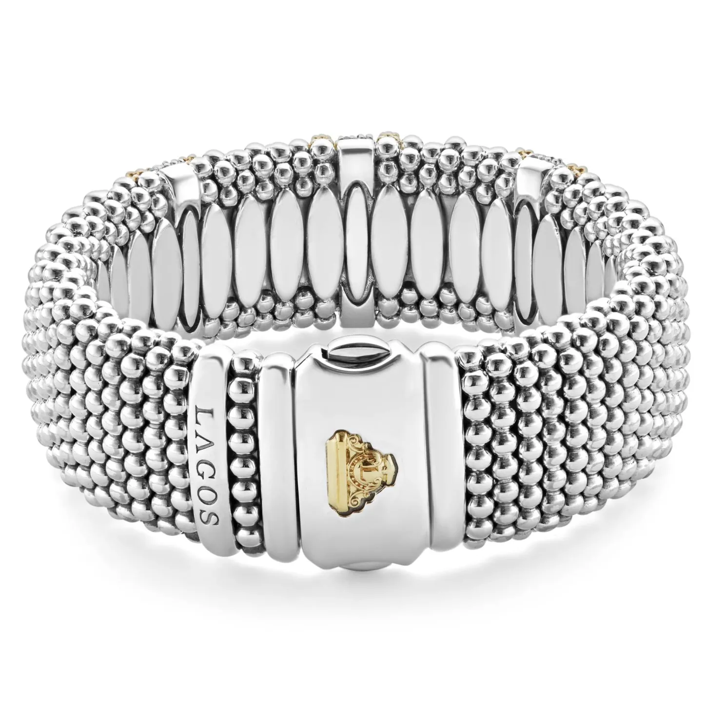 Three Diamond Stations Highlighted By 18K Gold Surrounded By Sterling Silver Caviar Beading. Lagos Diamonds Are The Highest Quality Natural Stones.