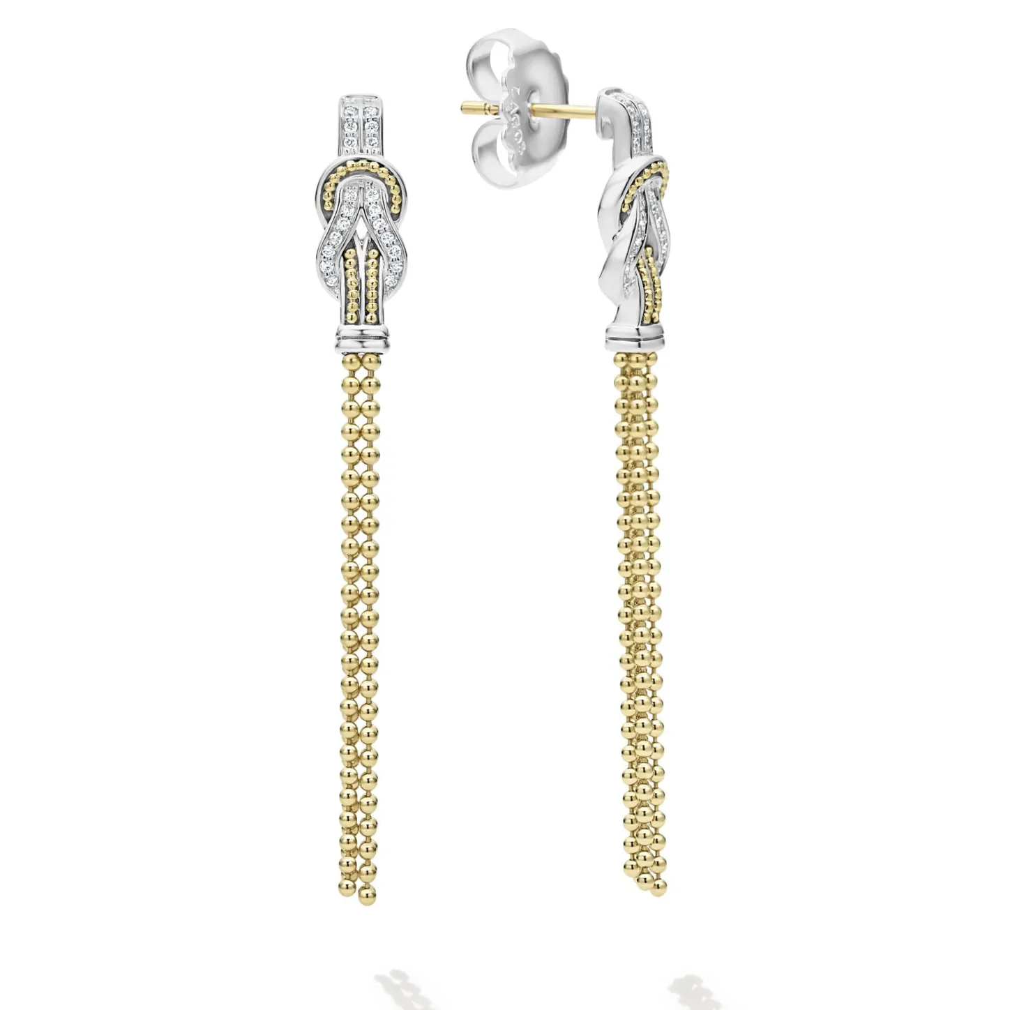 Diamonds And 18K Gold Woven In A Knot Motif Form These Unique Newport Stud Earrings Accented With A Gold Caviar Drop Tassel. Lagos Diamonds Are The Highest Quality Natural Stones.