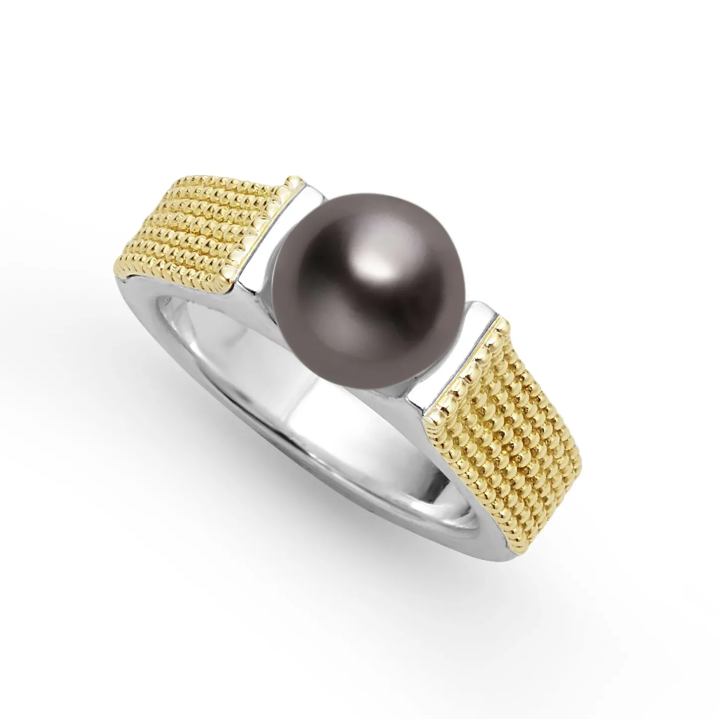 18K Gold Caviar Beading And Sterling Silver Form This Tahitian Black Pearl Ring.