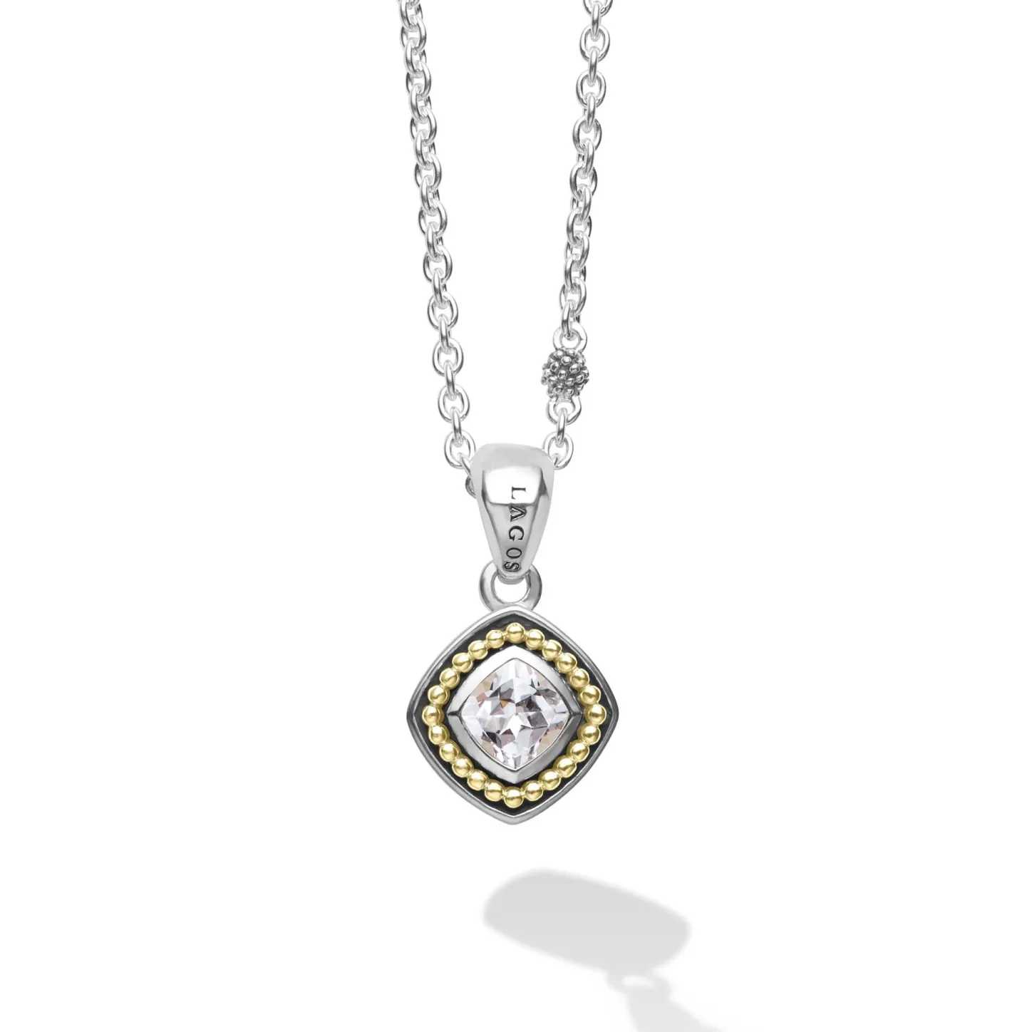 A White Topaz Gemstone Surrounded By Sterling Silver And 18K Gold Caviar Beading Form This Pendant. Finished On A Versatile Link Necklace.