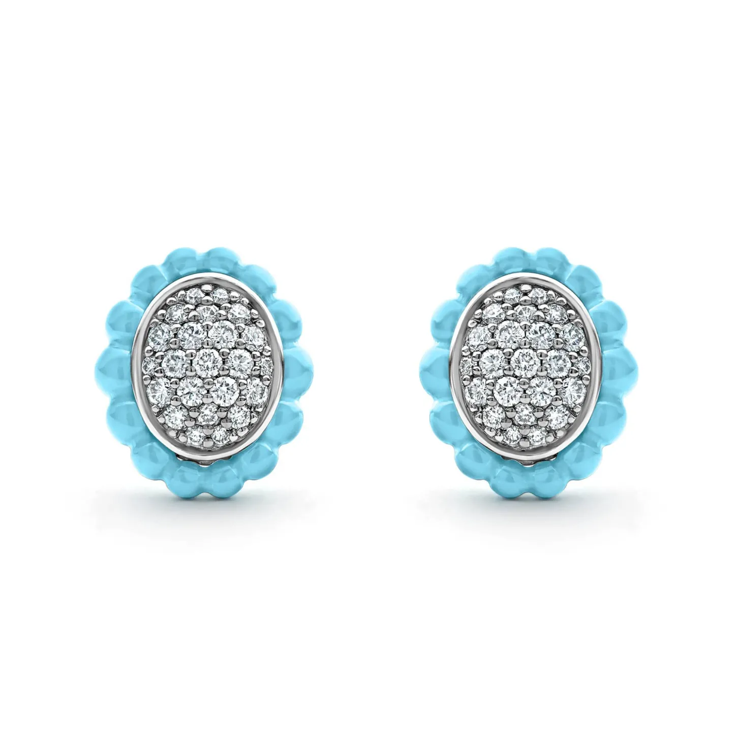 Blue Ceramic Beading Surrounds These Diamond Stud Earrings. Lagos Diamonds Are The Highest Quality Natural Stones.