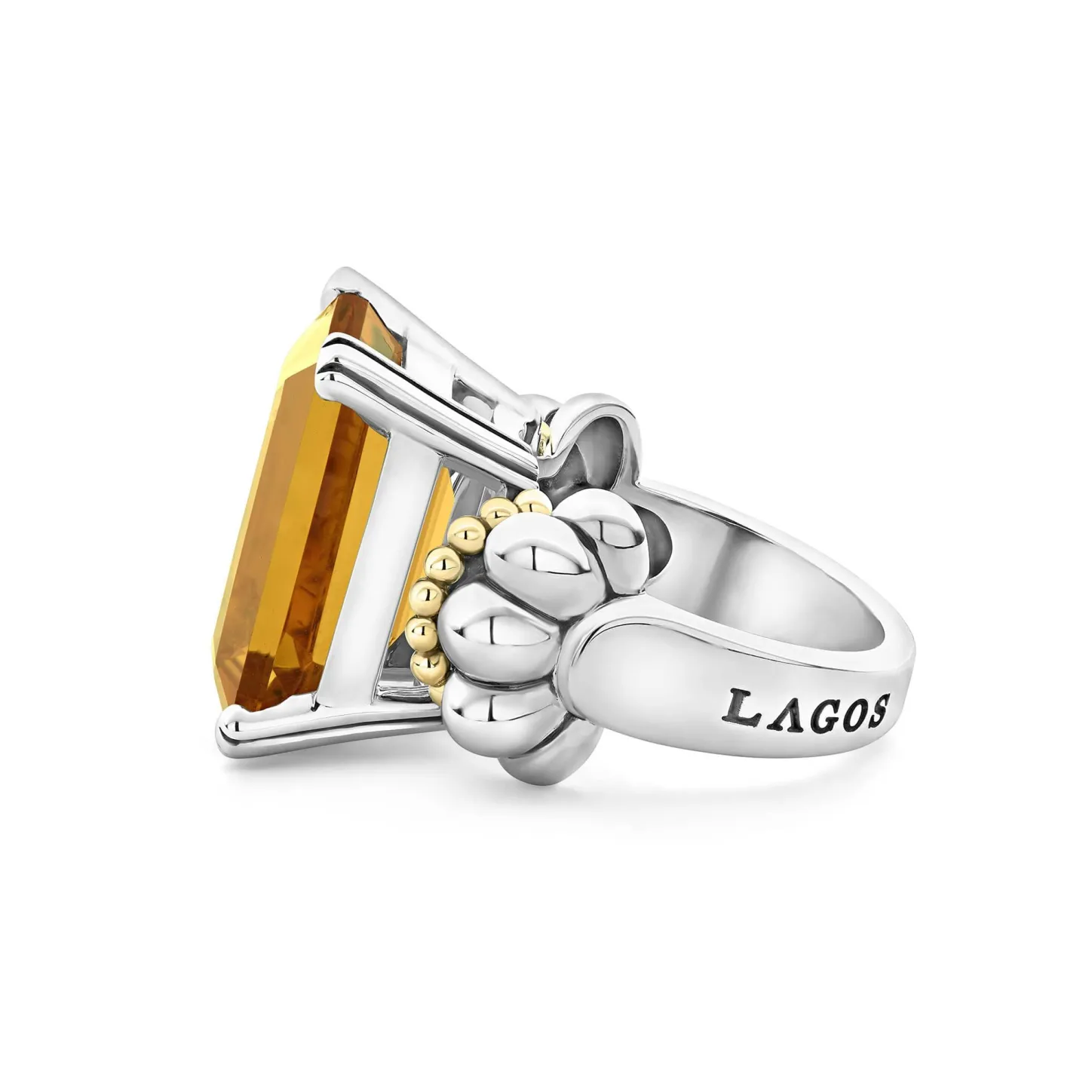 The Return Of A Lagos Icon. Our Signature Emerald-Cut Citrine Gemstone Ring With A Prong Setting In Sterling Silver And 18K Gold Caviar Beading.