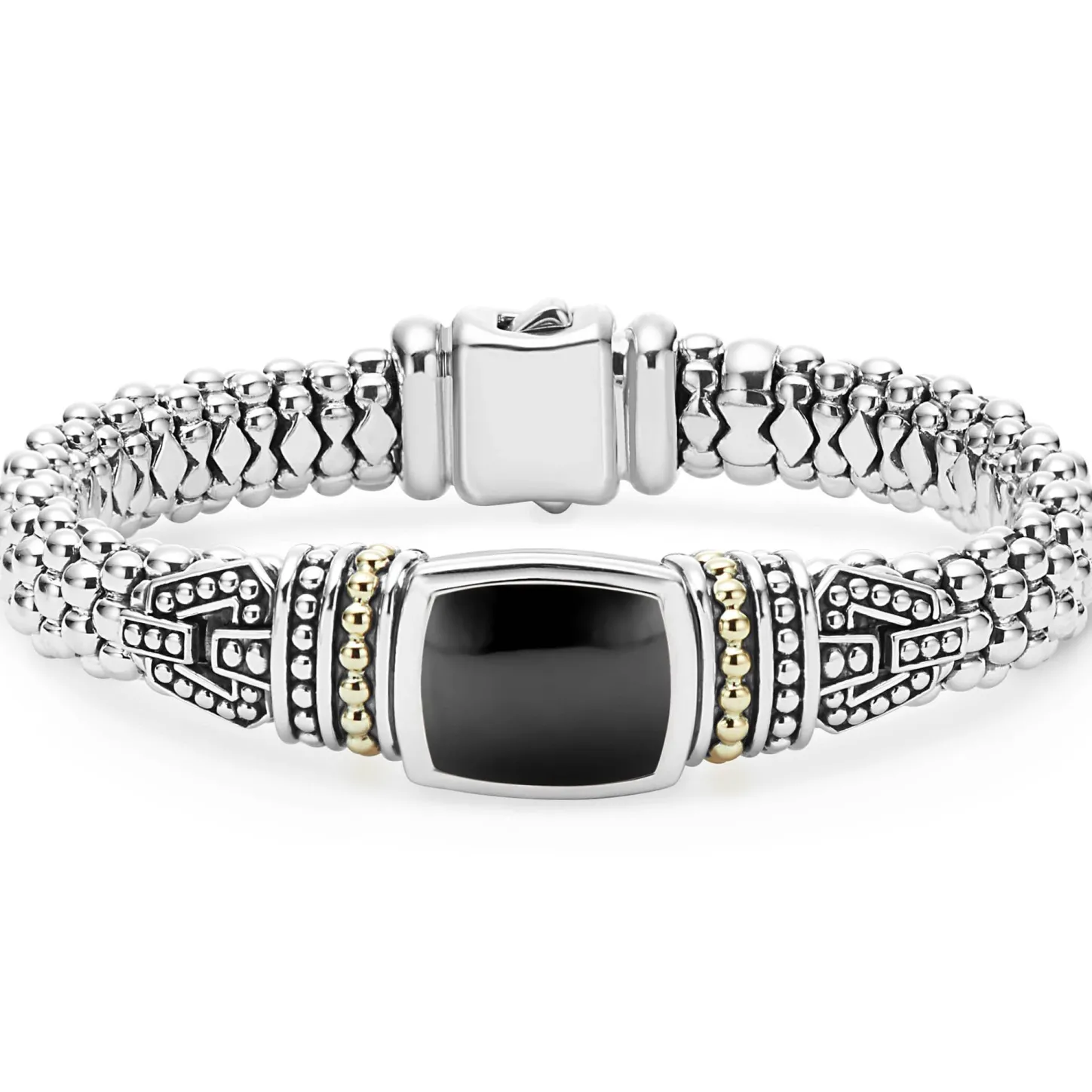 Onyx Bezel-Set Gemstone And Sterling Silver Caviar Beading With 18K Gold Detailing Forms This Bracelet.