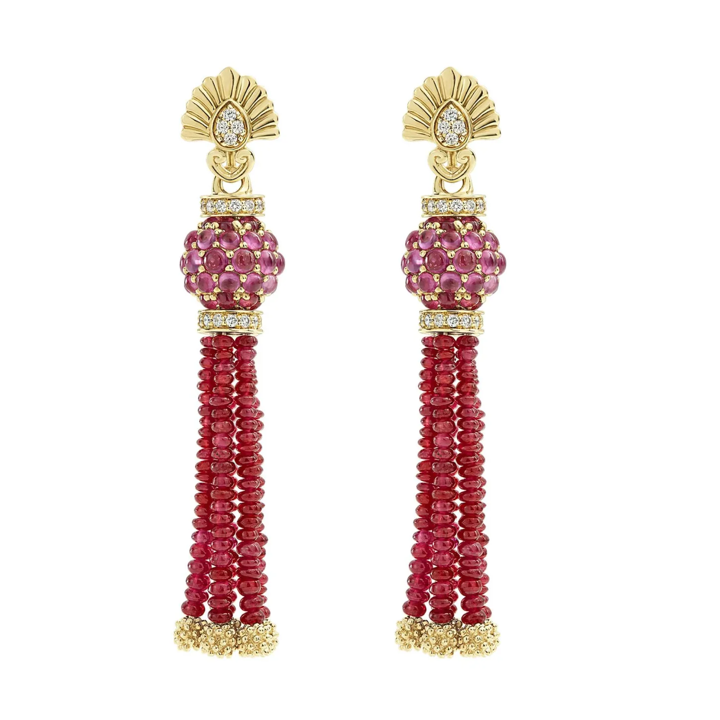A Lagos Exclusive. Five Ruby Strands With 18K Gold Caviar Beading Form These Dramatic Drop Earrings.