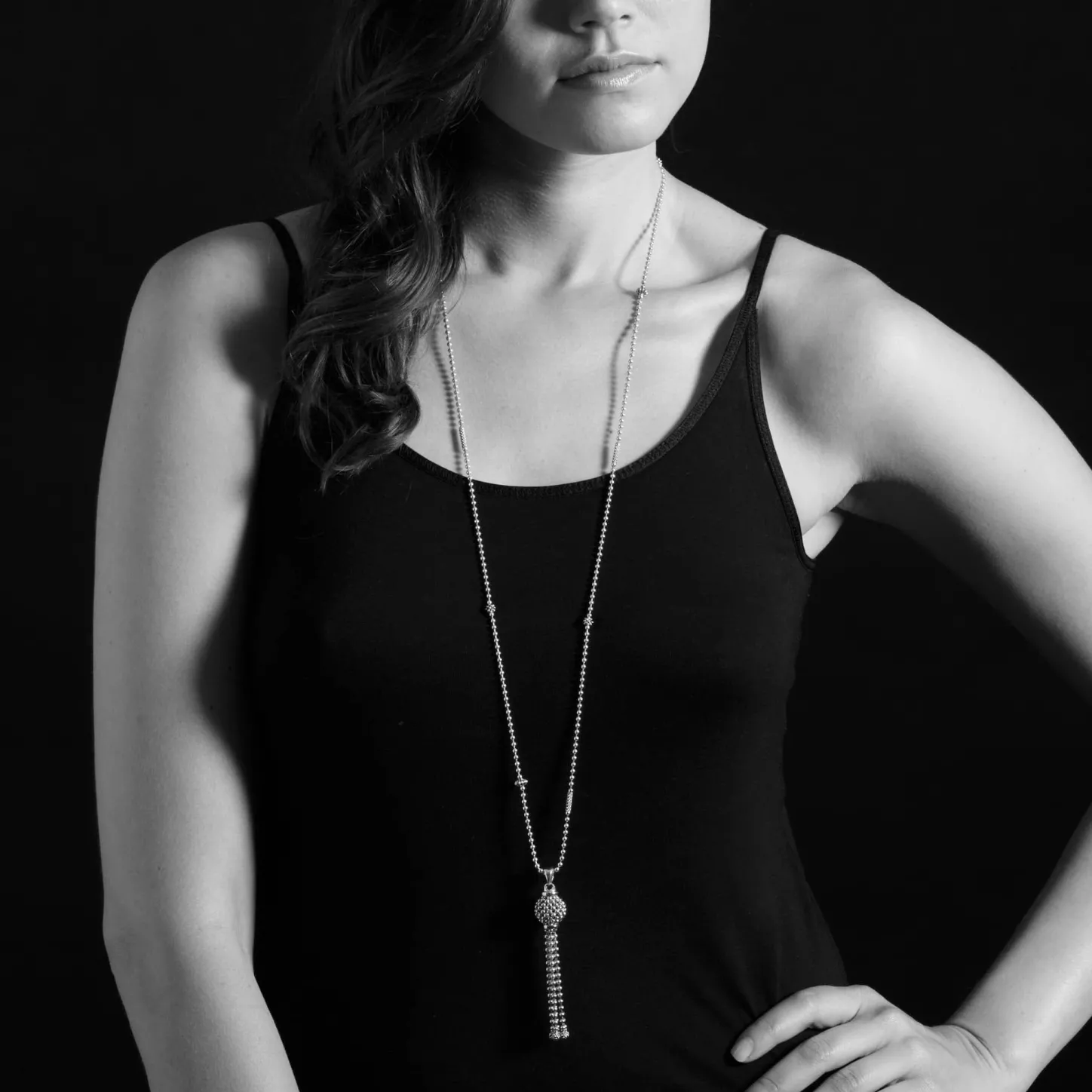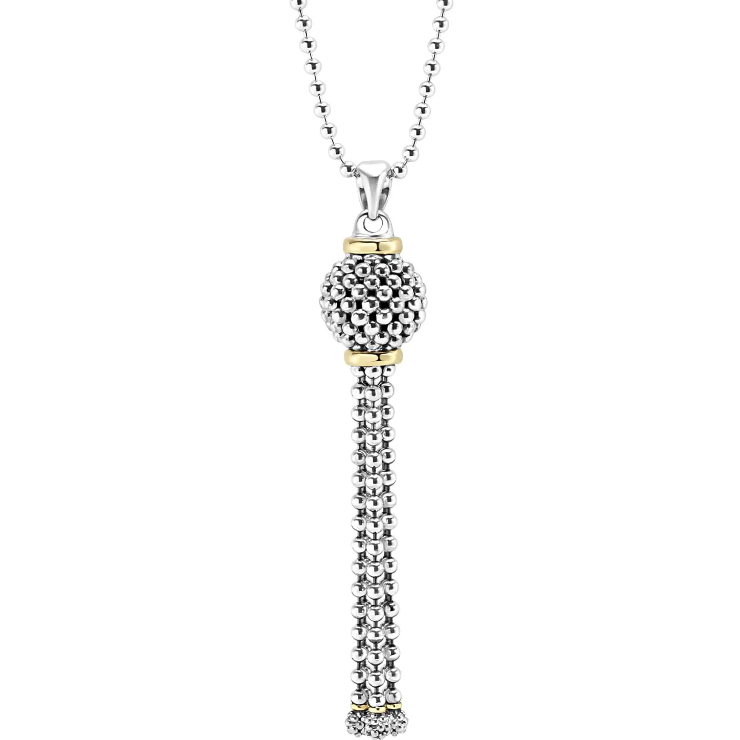 Caviar Tassel Pendant With 18K Gold And Sterling Silver On A Ball Chain Necklace Accented With Caviar Beaded Details.