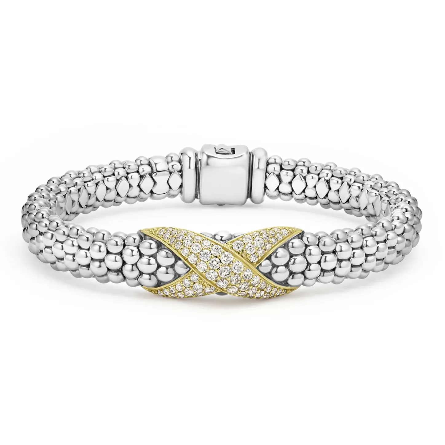 Smooth 18K Gold, Diamonds, And Sterling Silver Caviar Beading Form This X Station Bracelet. Lagos Diamonds Are The Highest Quality Natural Stones.