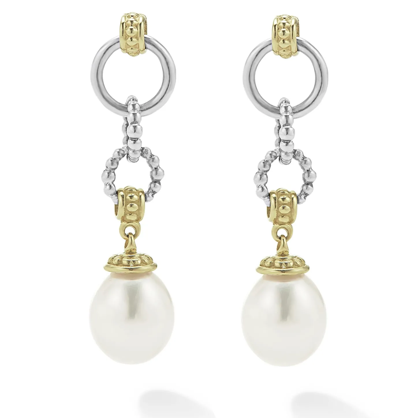 Sterling Silver And 18K Gold Caviar Beaded Post Earrings With Pearl Drop Detailing.