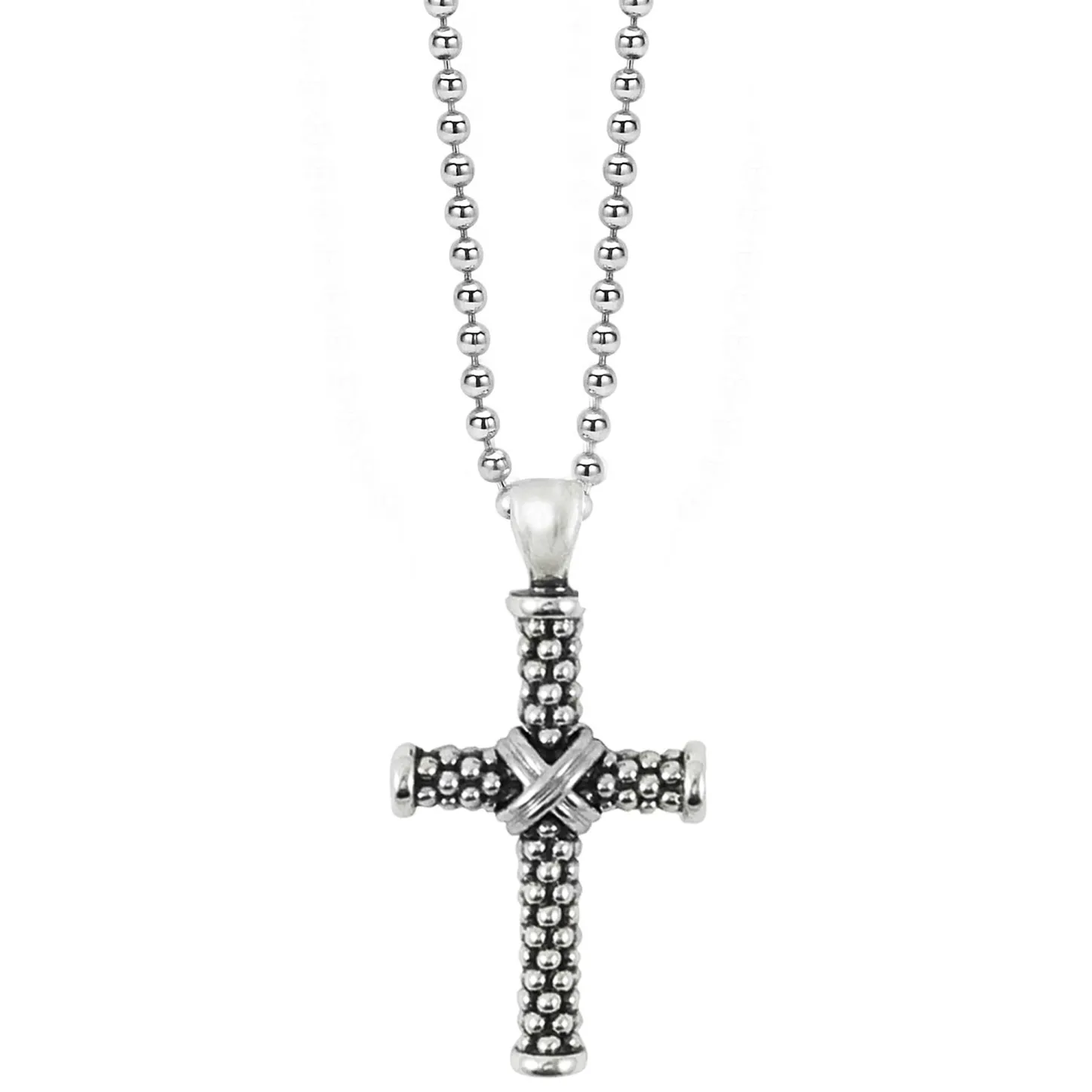 Signature Caviar Beads Accentuated By Highly Polished Sterling Silver Comprise This Cross Pendant Finished On A Ball Chain Necklace.