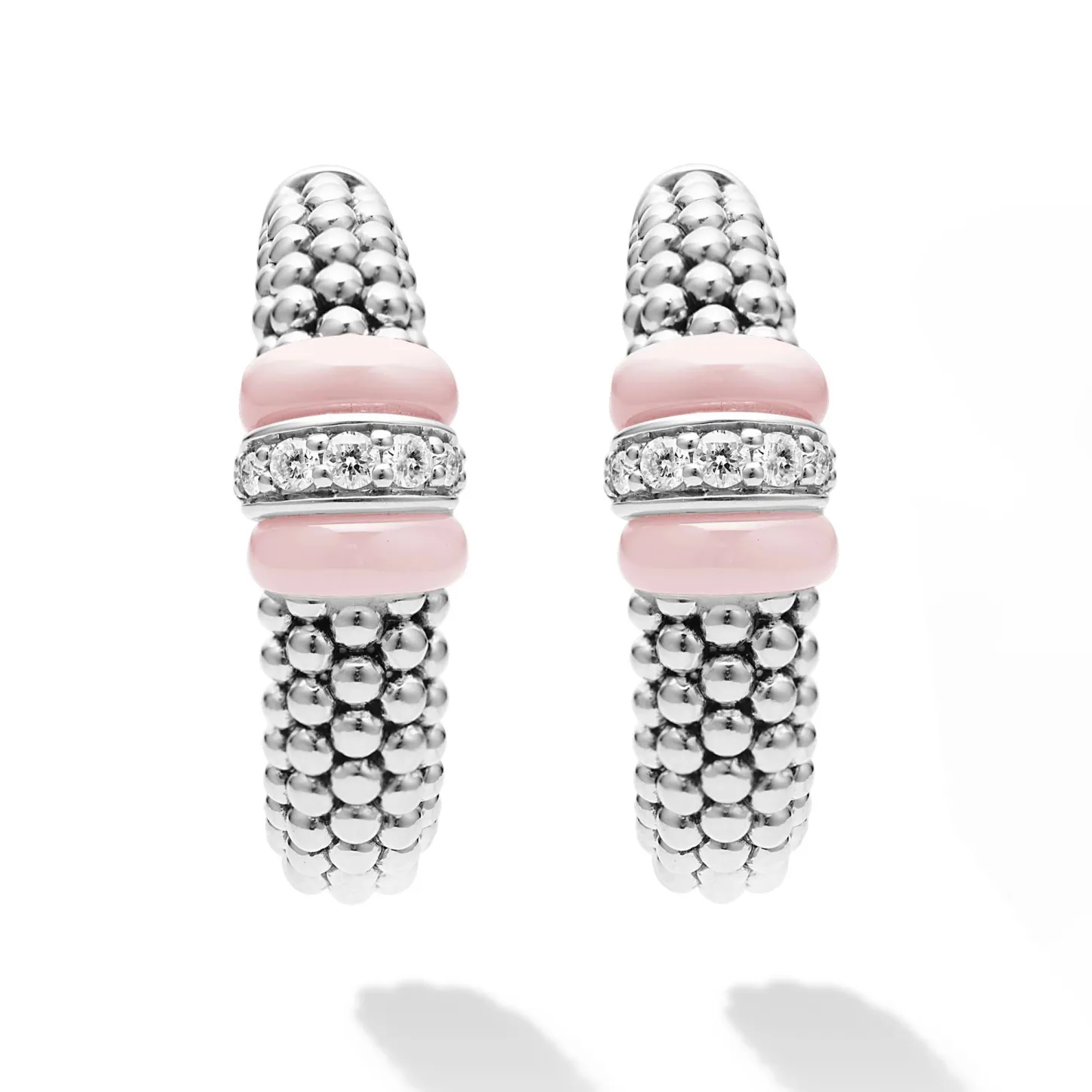Pink Ceramic And A Diamond Station Highlight These Sterling Silver Caviar Beaded Hoop Earrings. Lagos Diamonds Are The Highest Quality Natural Stones.