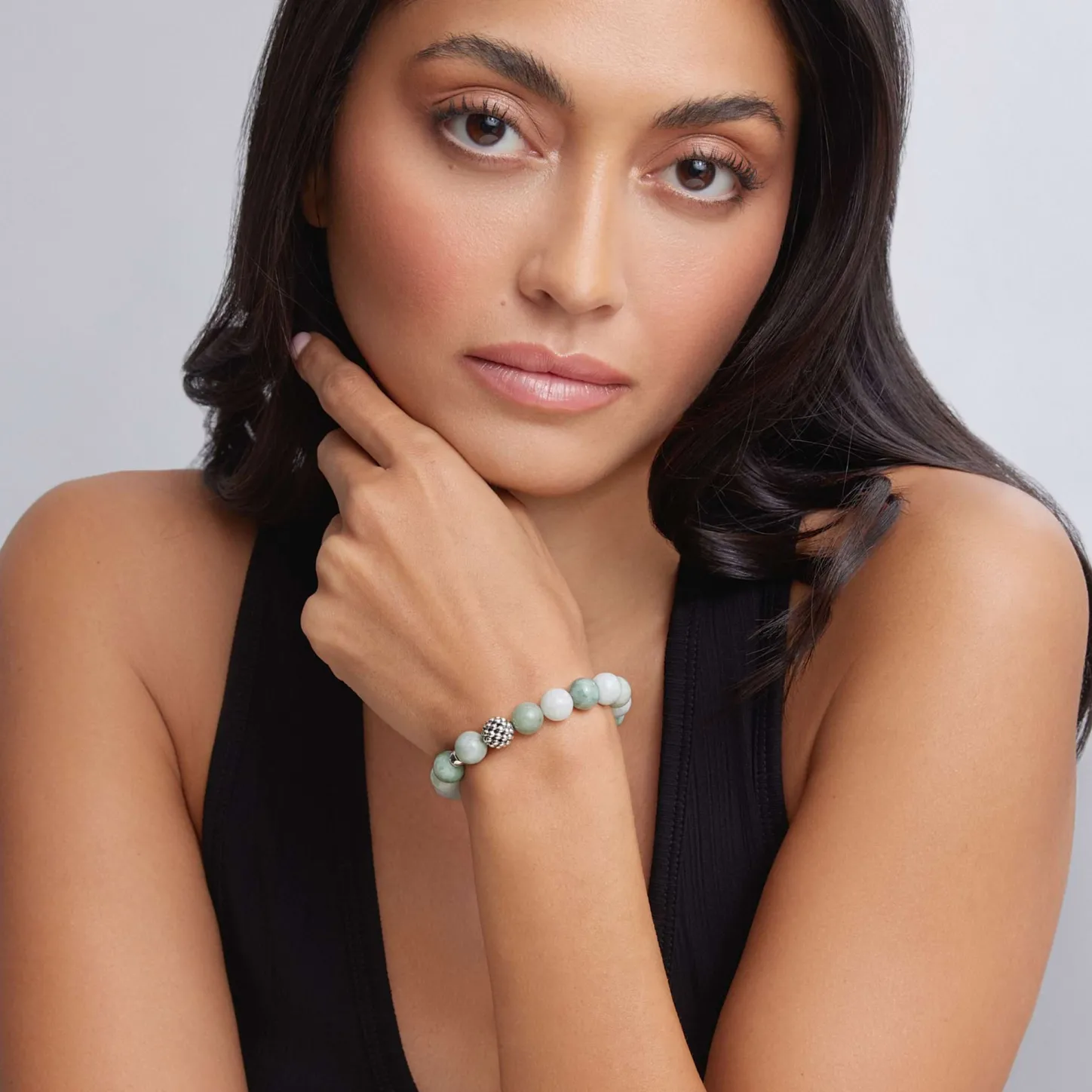 Jade Gemstone Bracelet With A Sterling Silver Caviar Beaded Station.