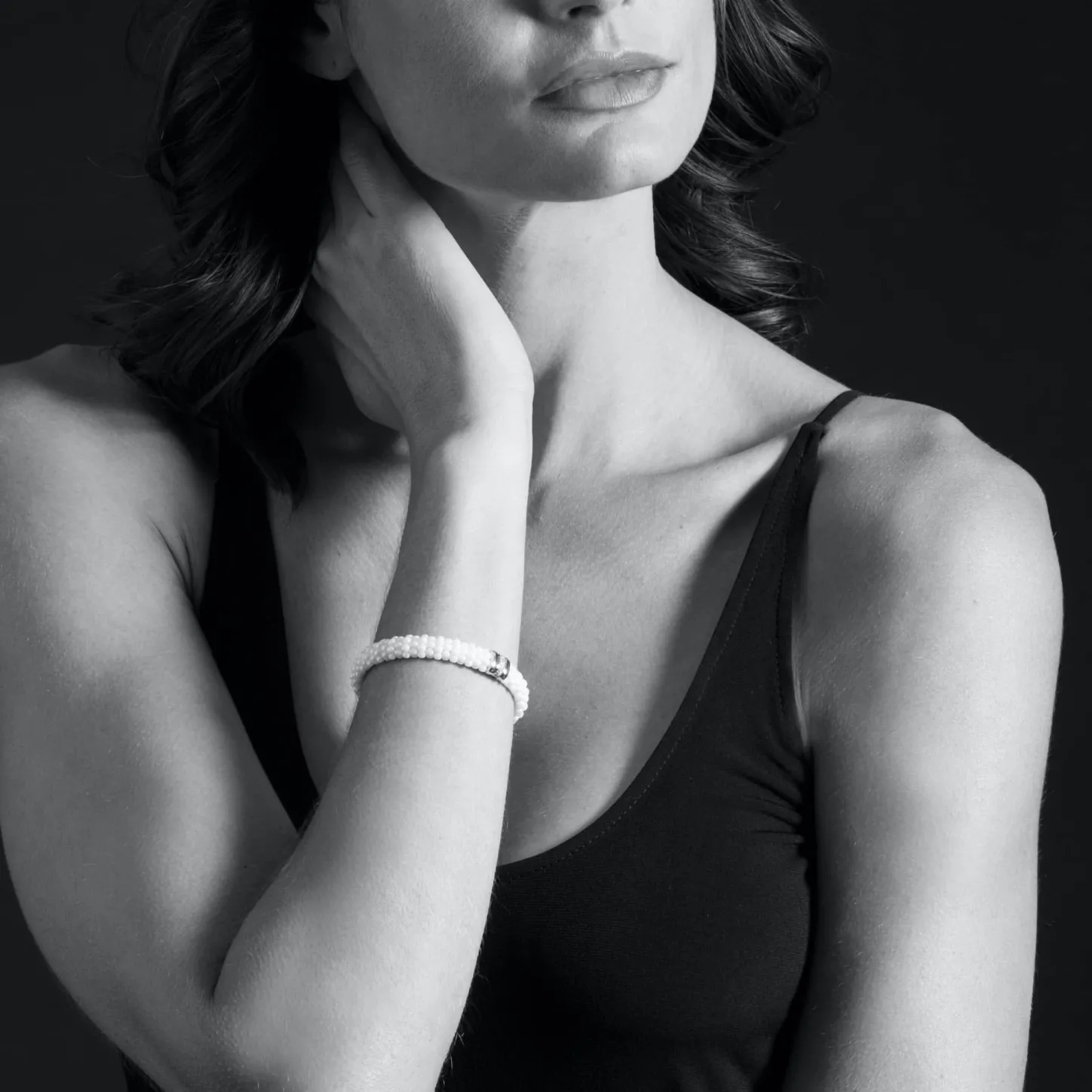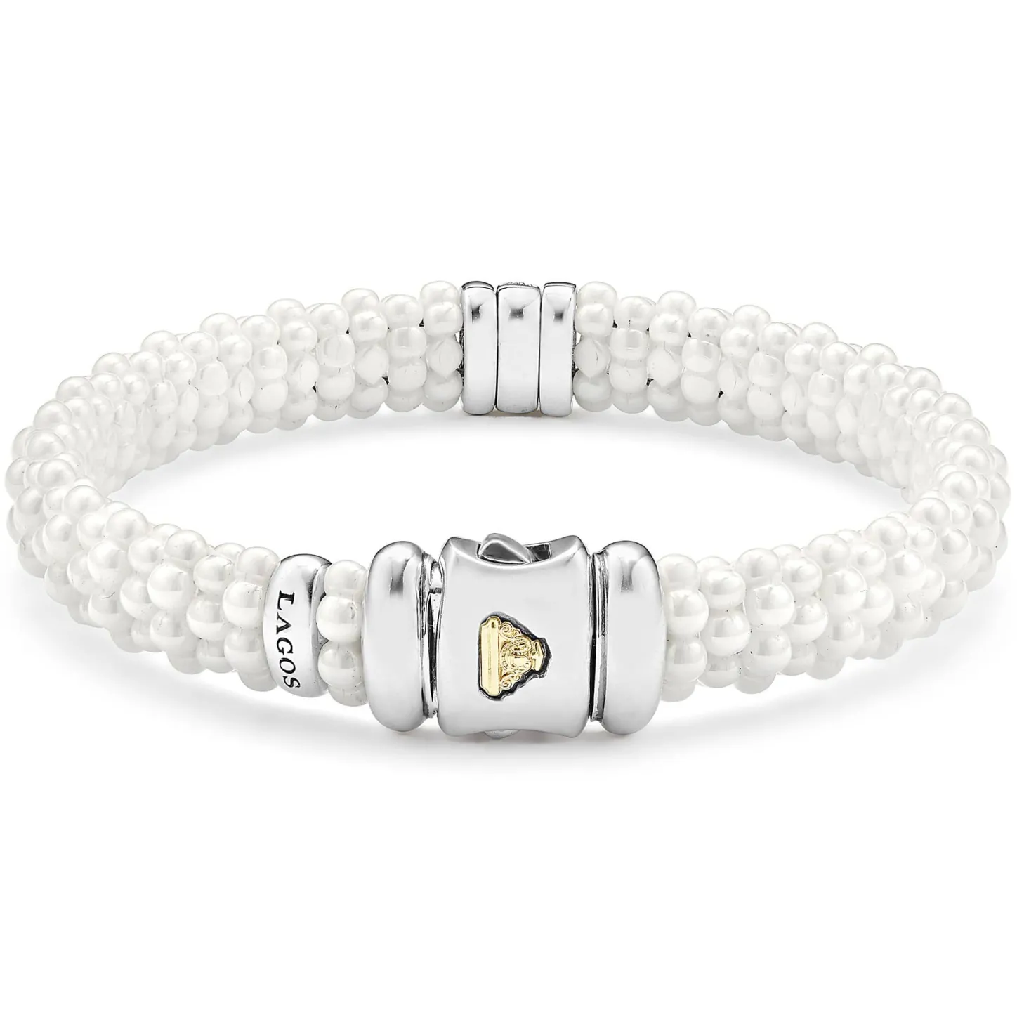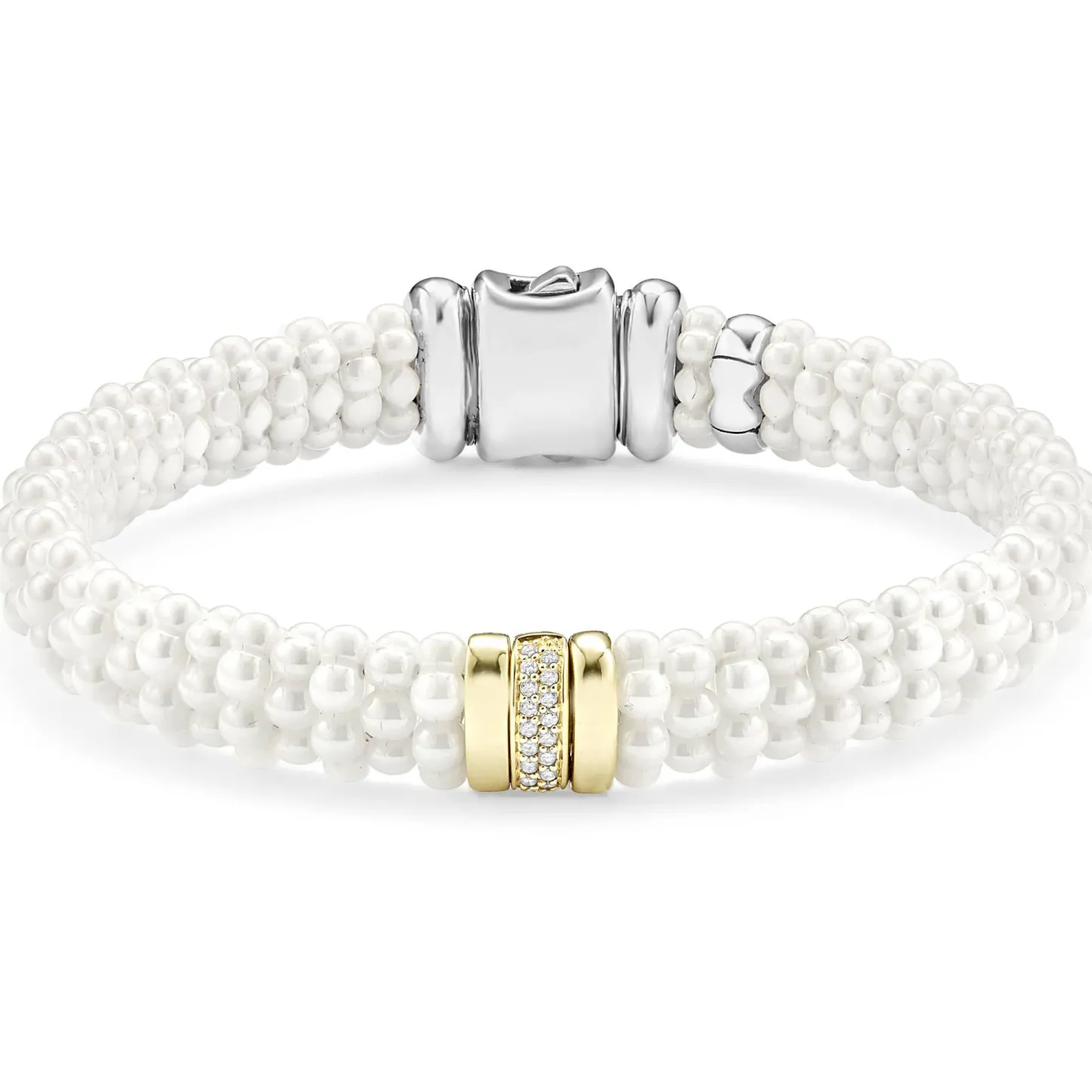 White Caviar Beaded Ceramic Bracelet With 18K Gold And One Diamond Station. Lagos Diamonds Are The Highest Quality Natural Stones.