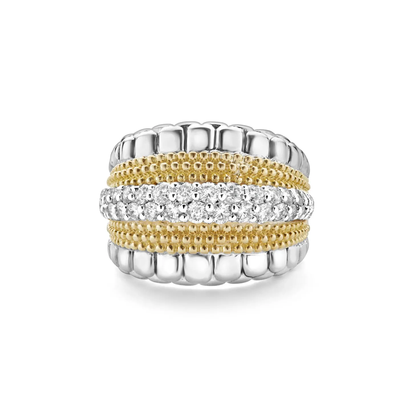 Diamonds And 18K Gold Caviar Beading Form This Statement Ring. Lagos Diamonds Are The Highest Quality Natural Stones.