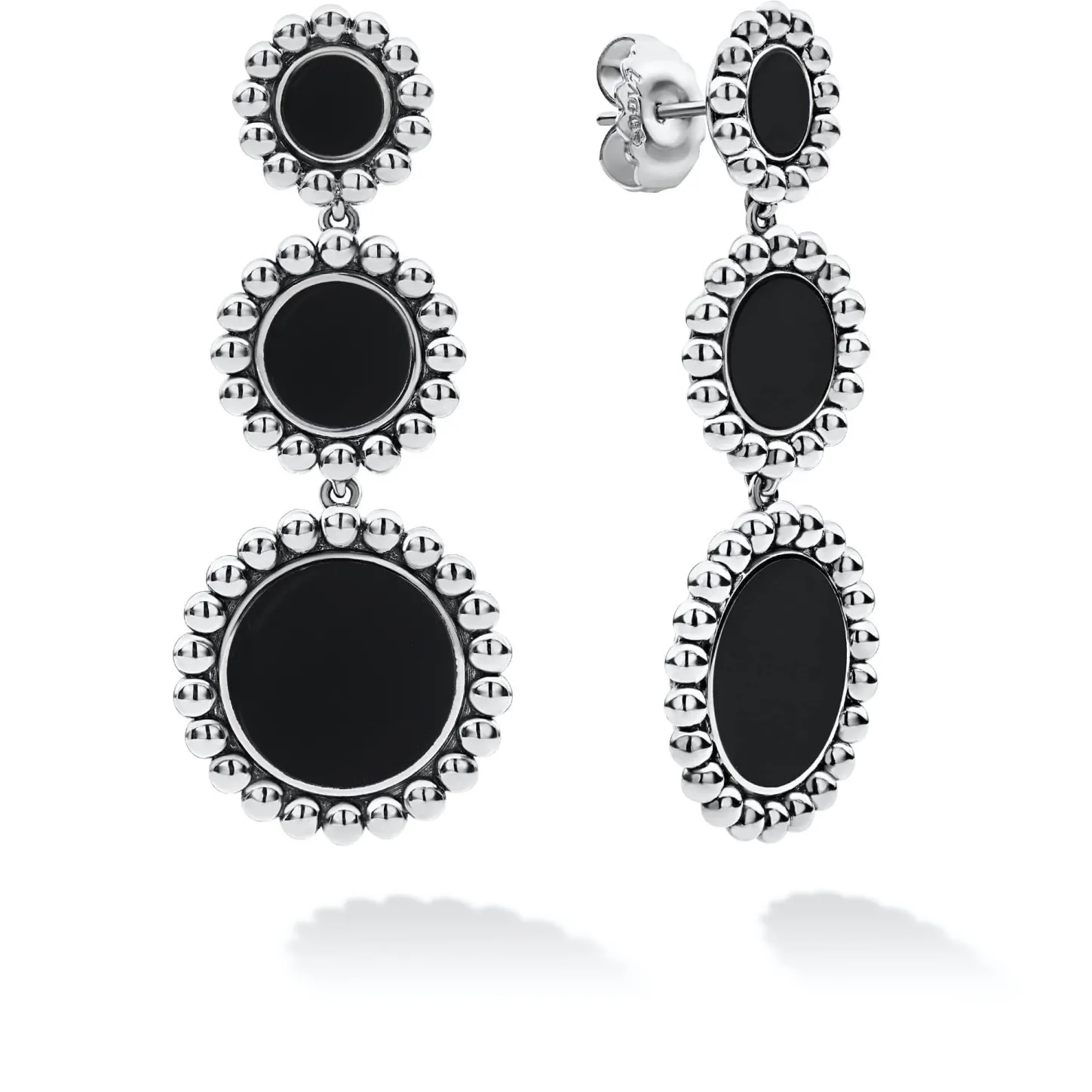 Onyx Gemstone Circle Drop Earrings Surrounded By Sterling Silver Caviar Beading.