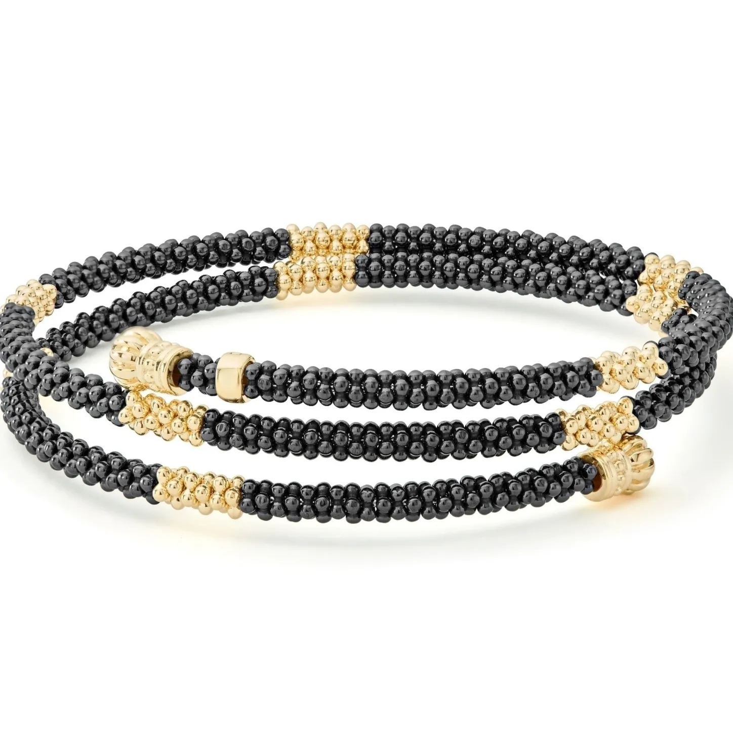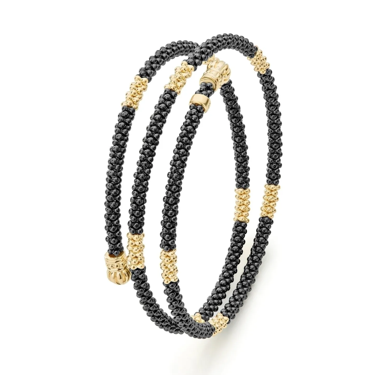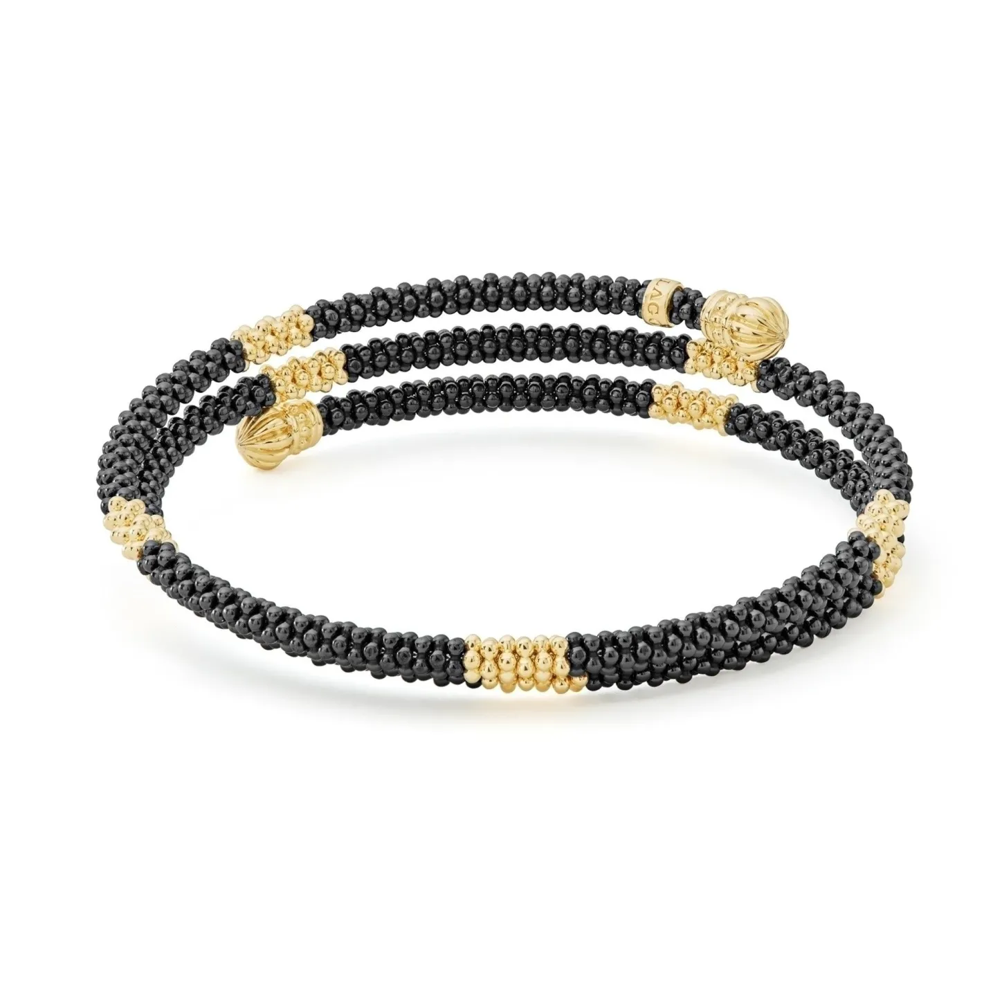 Ten Small 18K Gold Stations Highlighted By Black Ceramic Caviar Beading Form This Coil Bracelet Finished With An 18K Gold Endcaps.