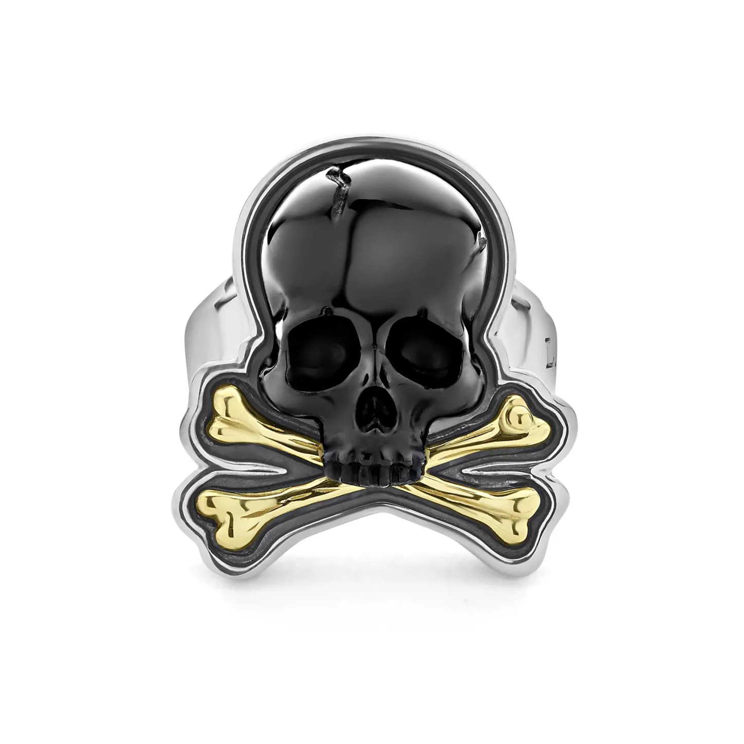 Intricately Crafted Black Agate Gemstone And 18K Gold Skull And Bones Motif Ring Surrounded By Sterling Silver.