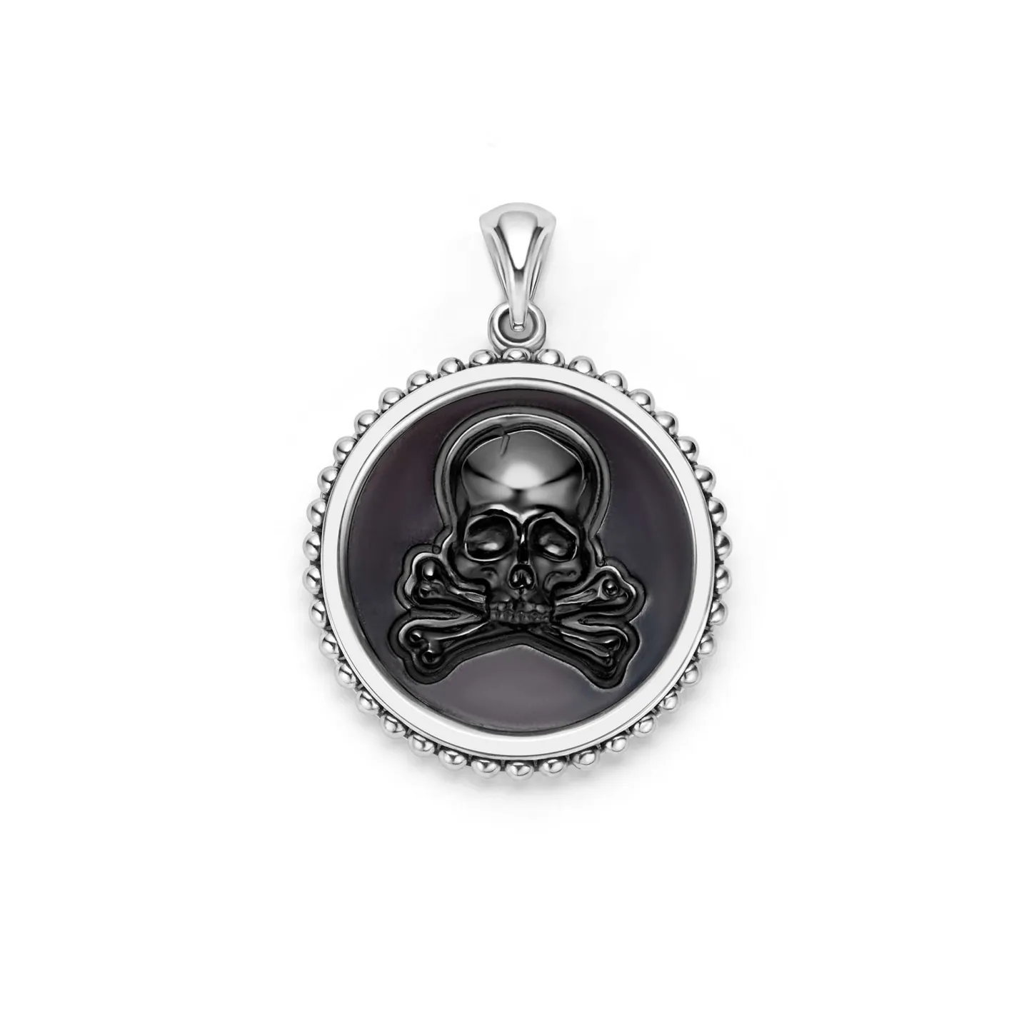 Black Agate Gemstone Surrounded By Sterling Silver Caviar Beading Form This Crossbone Emblem Amulet.