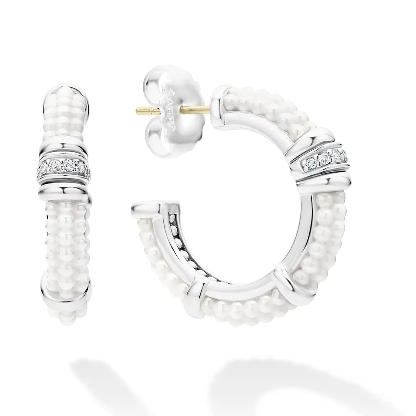 A Lagos Exclusive. White Ceramic Caviar Beading, Sterling Silver And Diamonds Form These Hoop Earrings. Lagos Diamonds Are The Highest Quality Natural Stones.