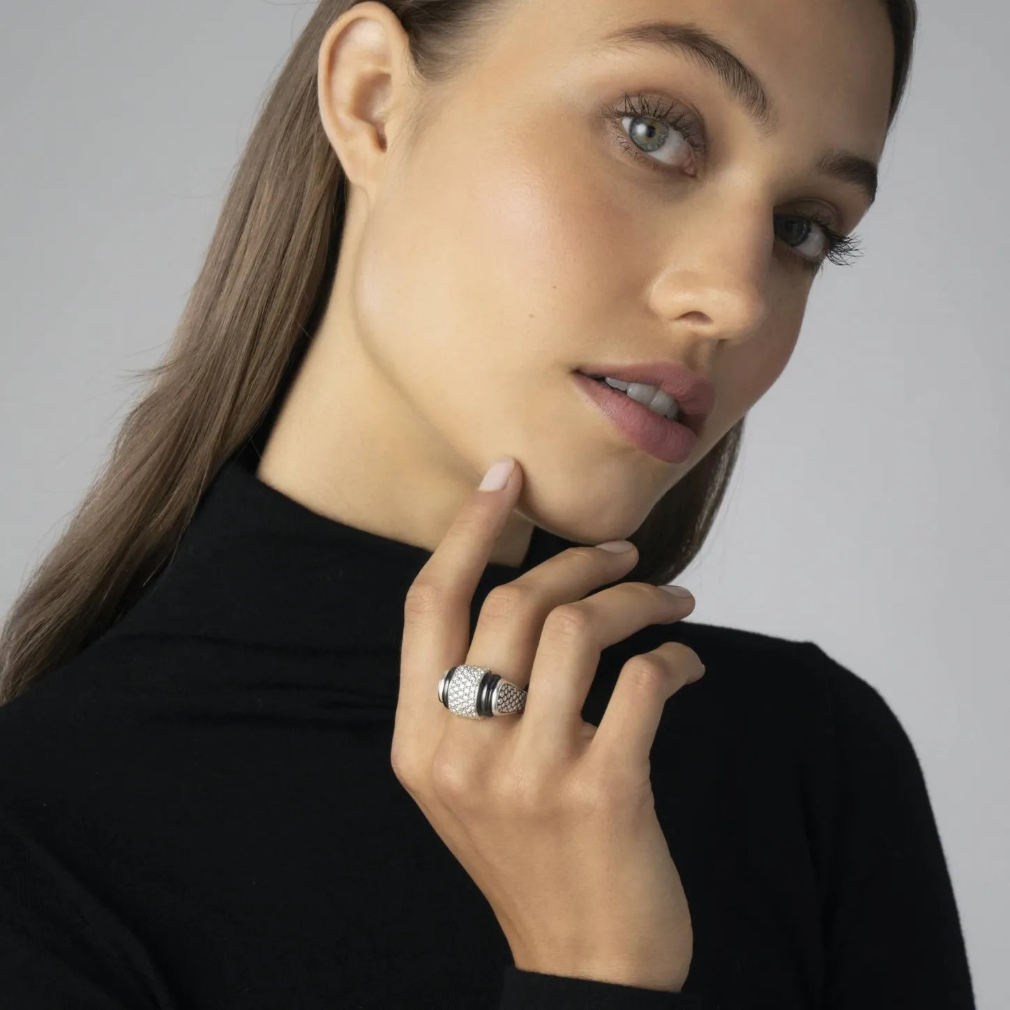 Diamonds Set In Sterling Silver Are Accented By Sleek Black Ceramic And Caviar Beading On This Statement Ring. Lagos Diamonds Are The Highest Quality Natural Stones.