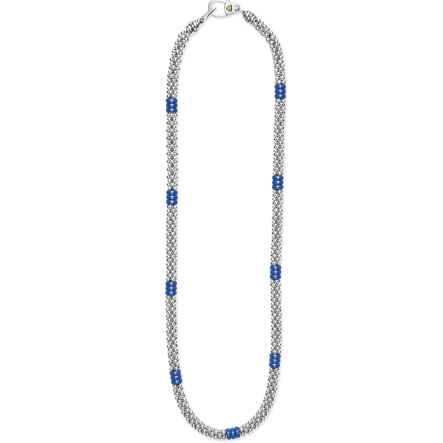 A Sterling Silver Caviar Beaded Necklace With Nine Ultramarine Ceramic Stations.