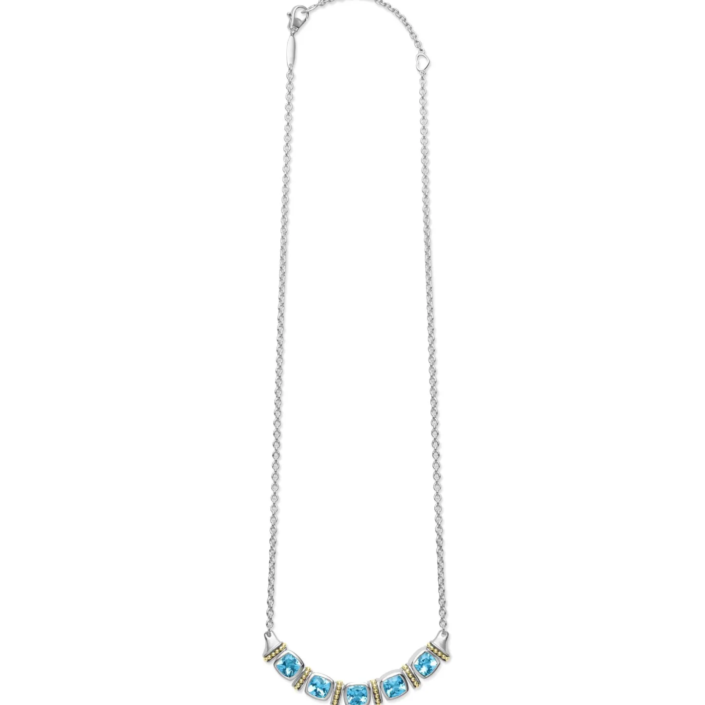 Five Swiss Blue Topaz Gemstones Accent This Necklace Surrounded By Sterling Silver And 18K Gold Caviar Beading.