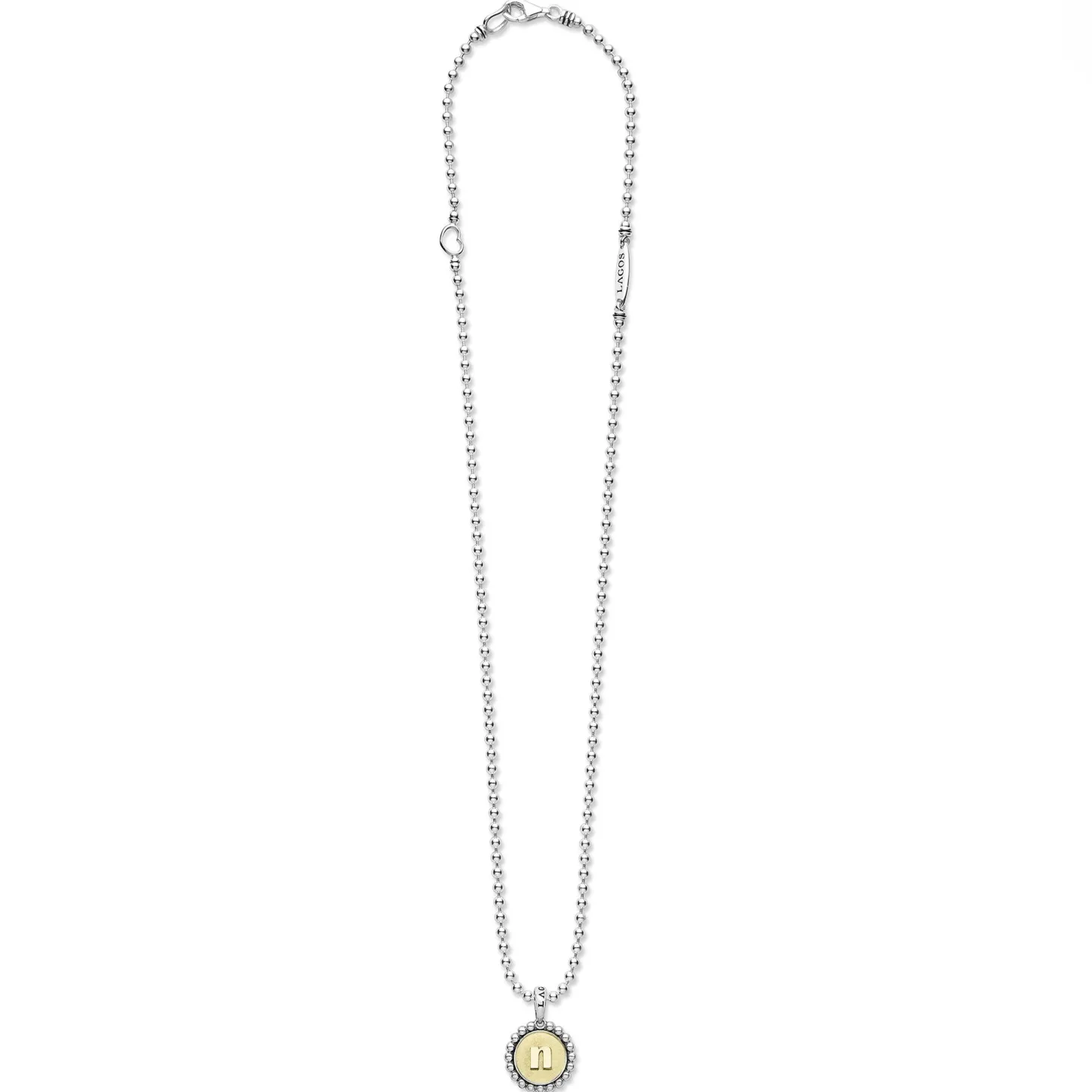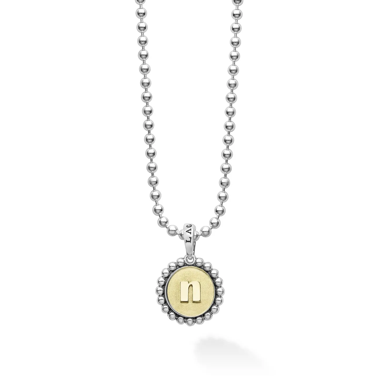 Our Signature Caviar Sterling Silver And 18K Gold Initial ‘N’ Charm Finished On A Sterling Silver Ball Chain Necklace.