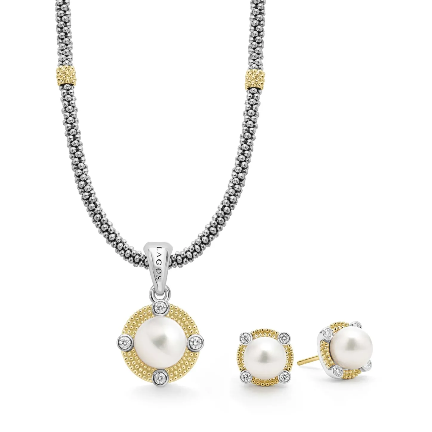A Lagos Exclusive. One Set Of 18K Gold And Diamond Cultured Freshwater Pearl Necklace And Earrings.