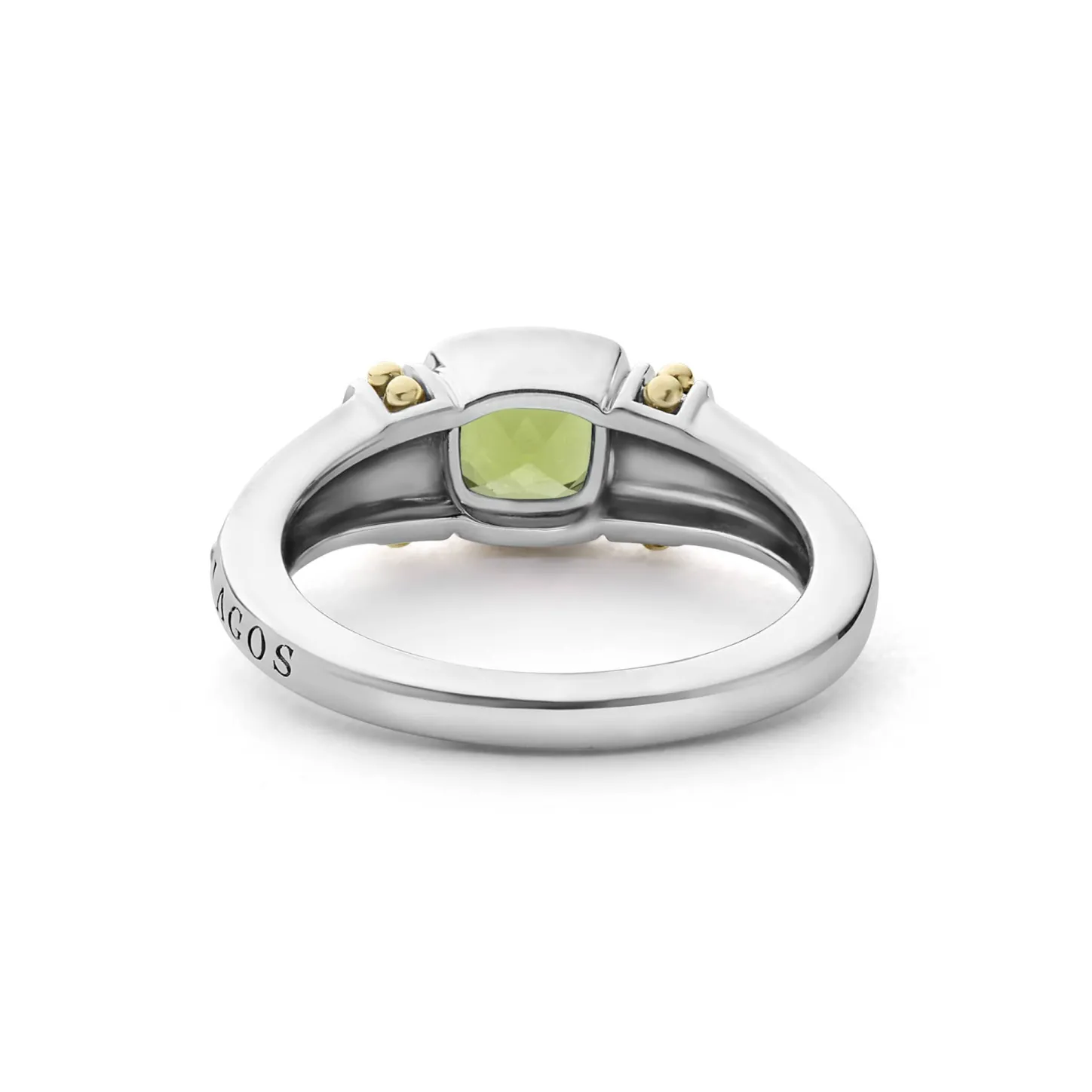 Peridot Gemstone Ring Surrounded By Sterling Silver And 18K Gold Caviar Beading.