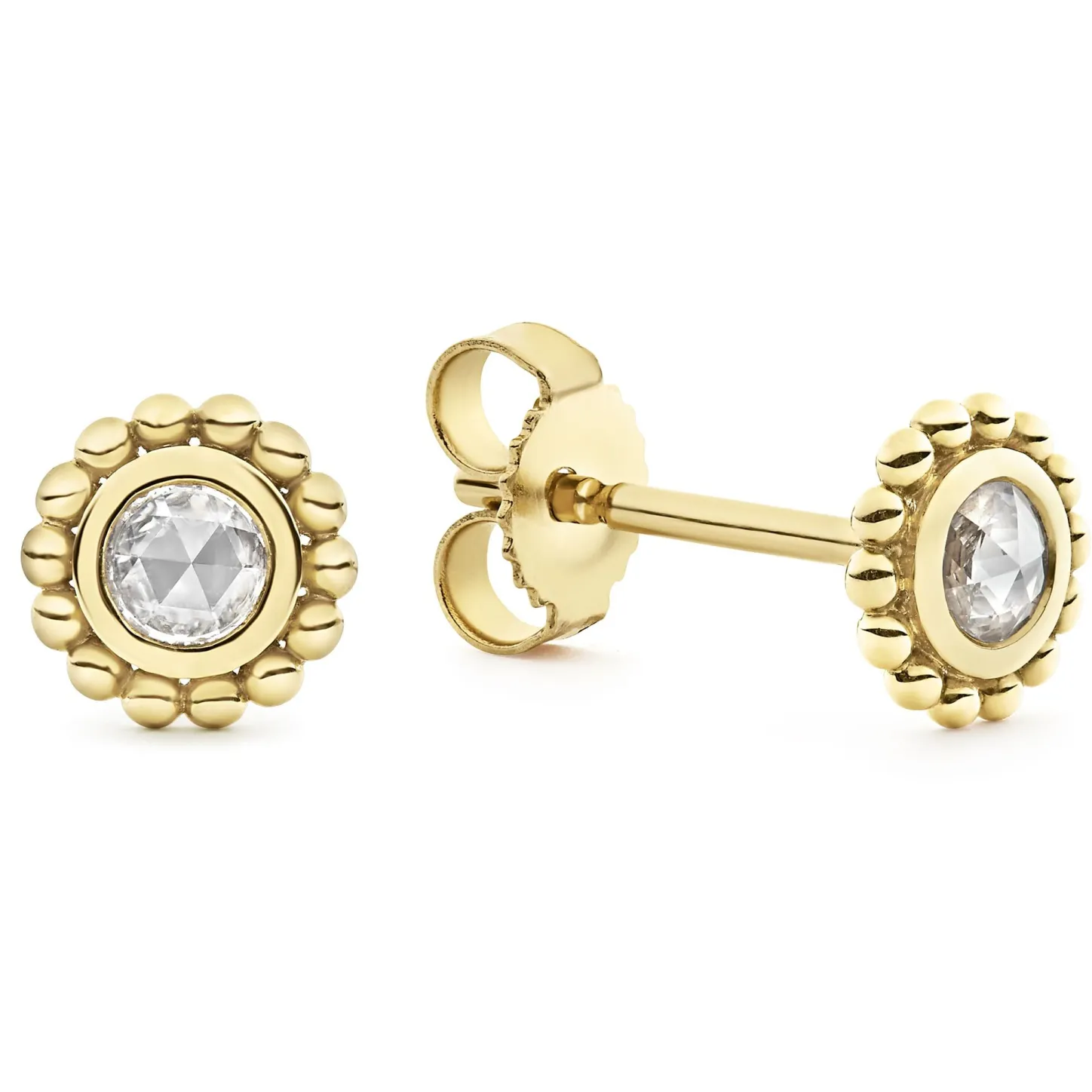Rose Cut Diamond Stud Earrings Set And Surrounded By 18K Gold Caviar Beading. Lagos Diamonds Are The Highest Quality Natural Stones.