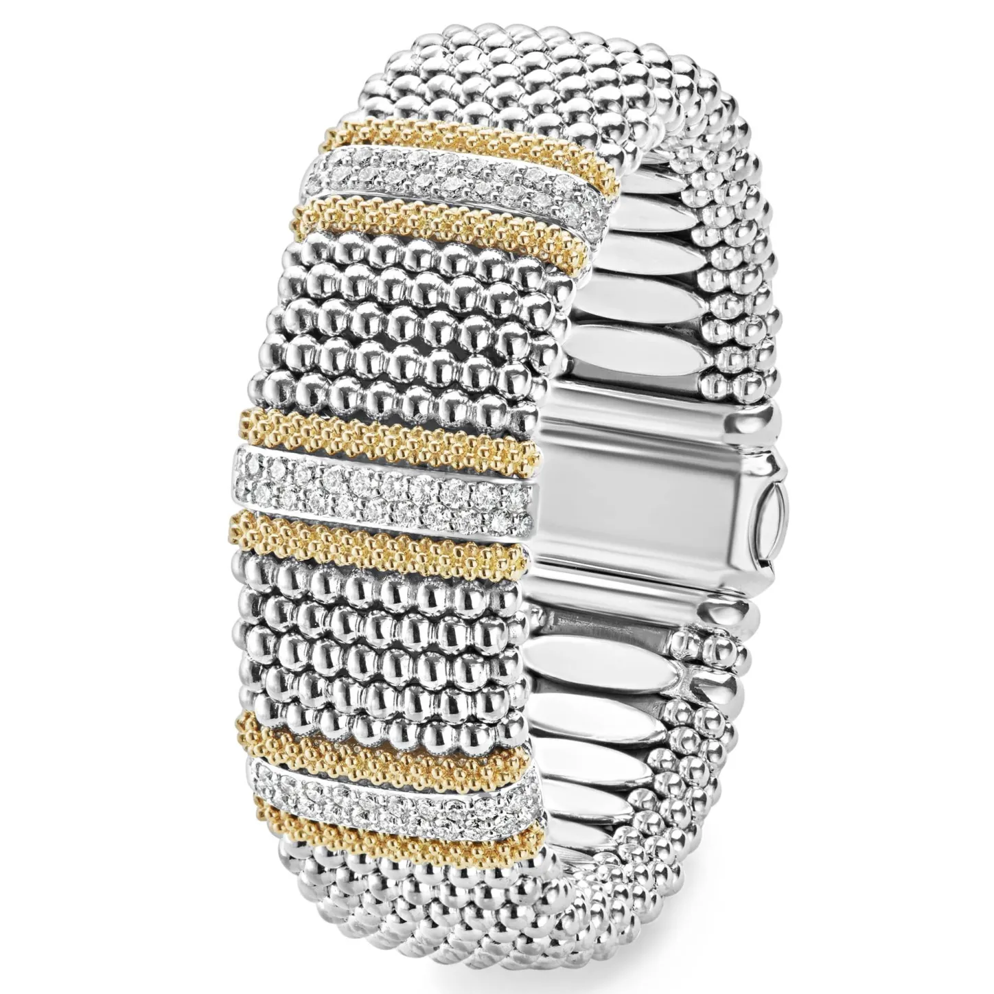 Three Diamond Stations Highlighted By 18K Gold Surrounded By Sterling Silver Caviar Beading. Lagos Diamonds Are The Highest Quality Natural Stones.