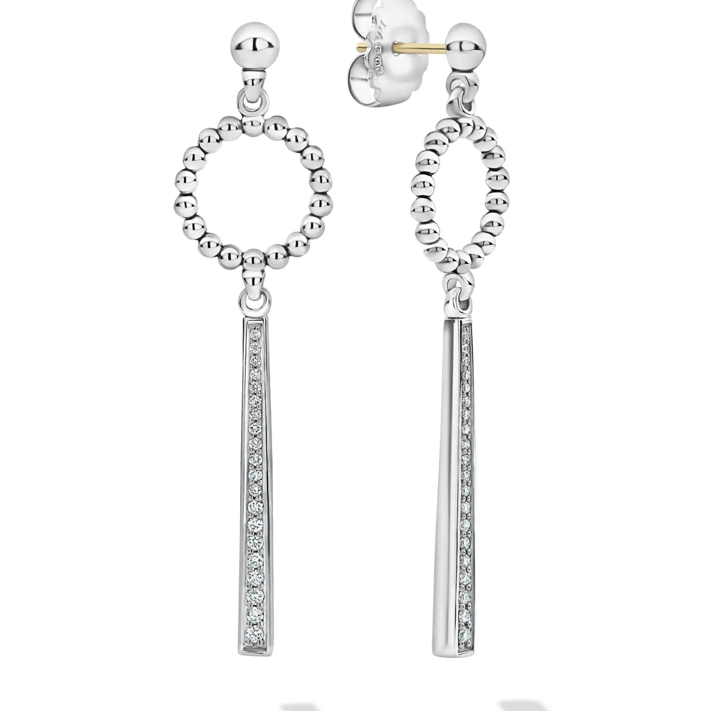 Sterling Silver Caviar Beaded Circle Drop Earrings With A Long, Linear Diamond Station. Lagos Diamonds Are The Highest Quality Natural Stones.