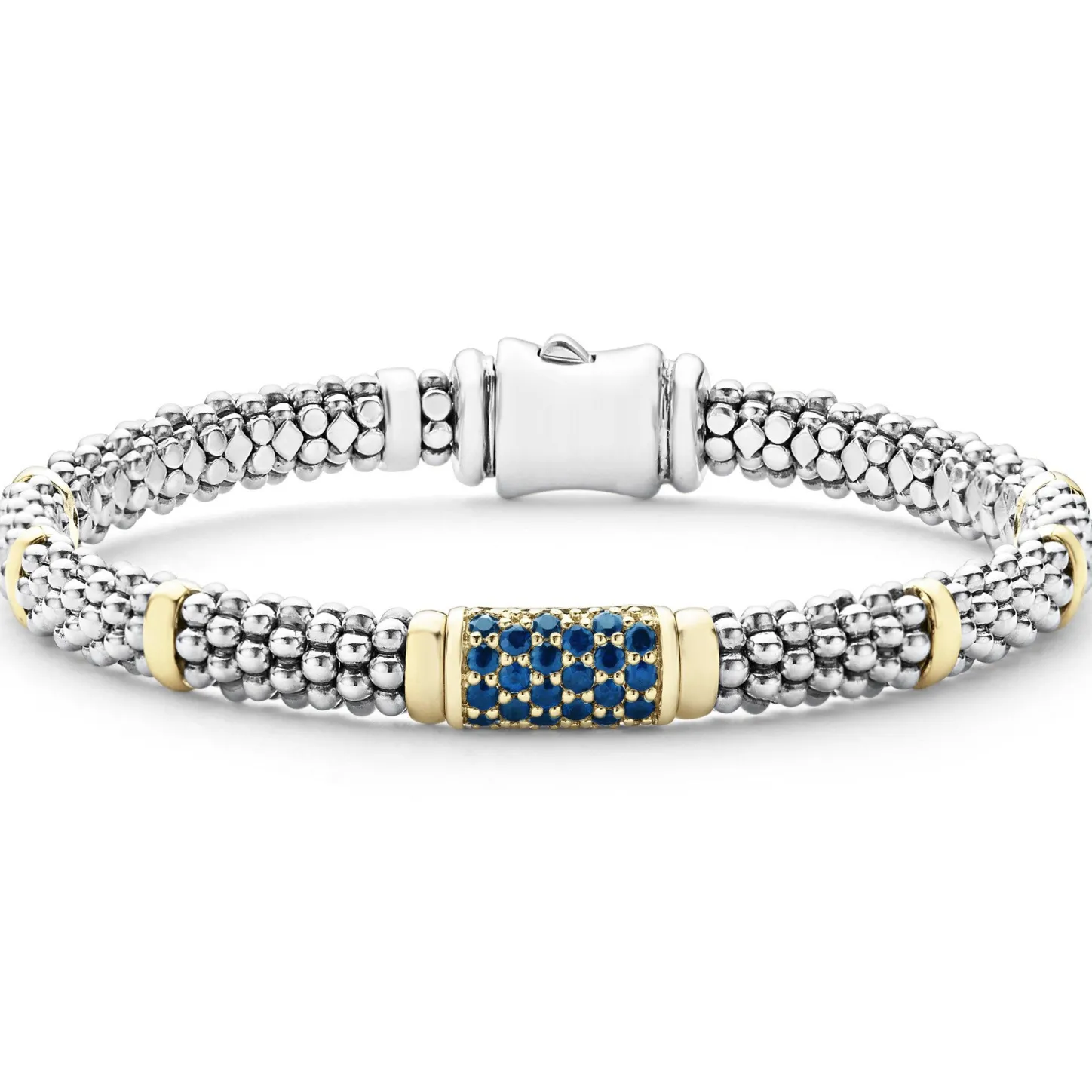 Ten 18K Gold Stations Highlight This Sterling Silver Caviar Beaded Bracelet With A Pavé Station Of Blue Sapphire Precious Gemstones.