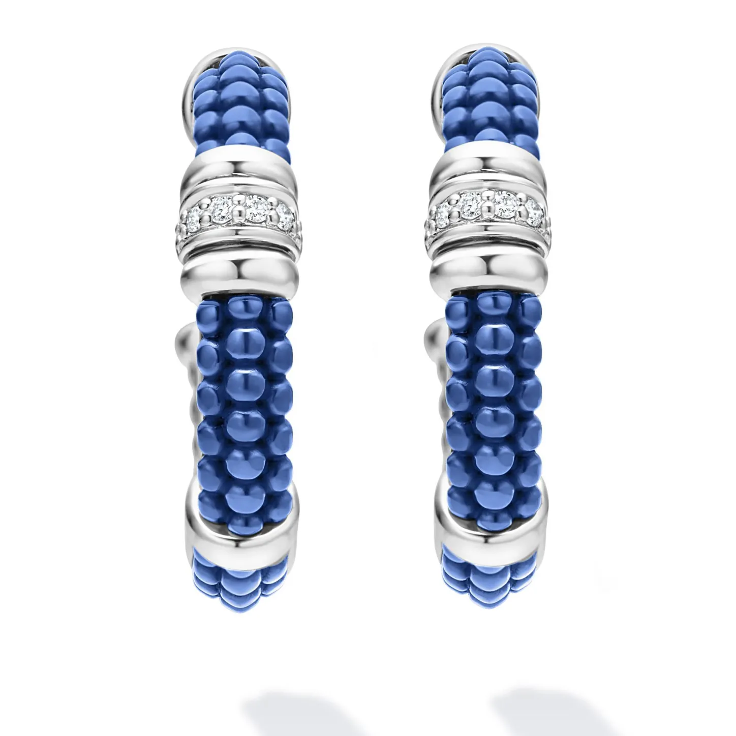 Ultramarine Ceramic Caviar Beading, Sterling Silver And Diamonds Form These Hoop Earrings. Lagos Diamonds Are The Highest Quality Natural Stones.