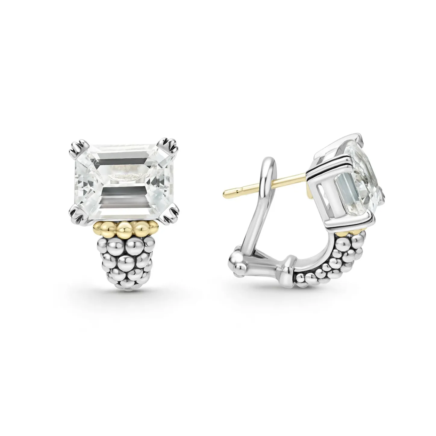 White Topaz Emerald-Cut Gemstone Earring With A Prong Setting In Sterling Silver And 18K Gold Caviar Beading.