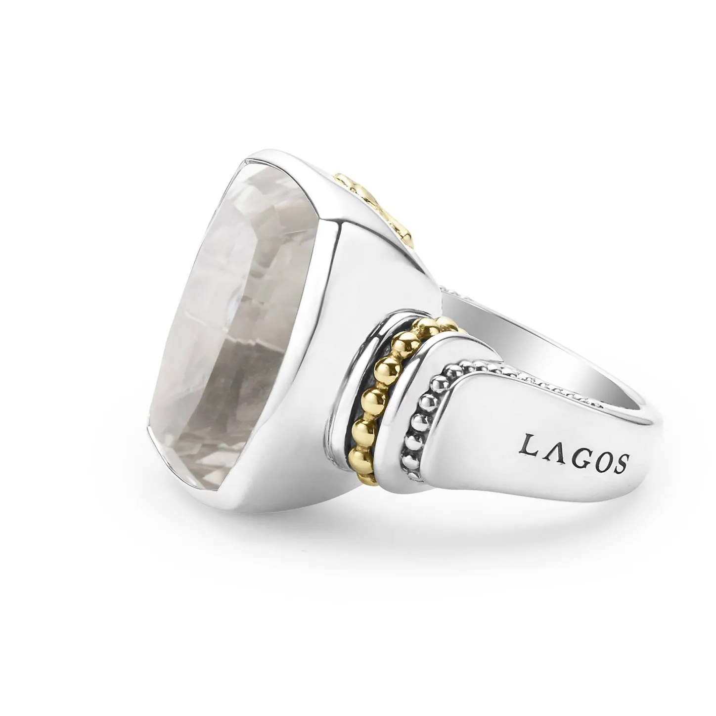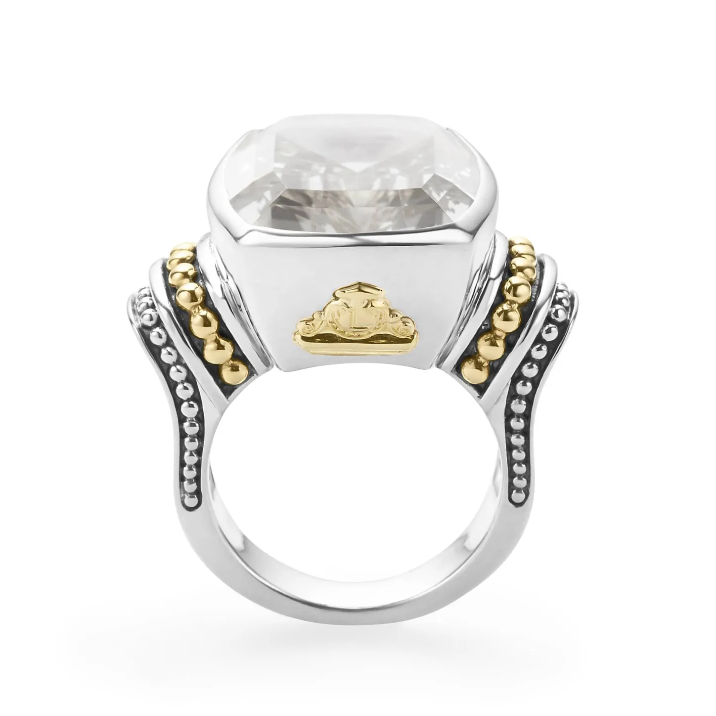 White Topaz Bezel-Set Gemstone Statement Ring With 18K Caviar Beading On A Sterling Silver Band.