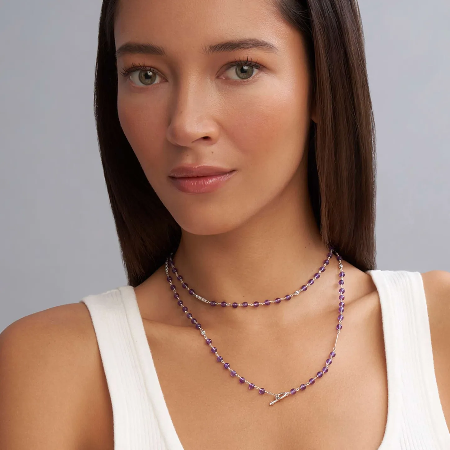 Amethyst And Sterling Silver Caviar Beaded Necklace Finished With Signature Lobster Clasp.