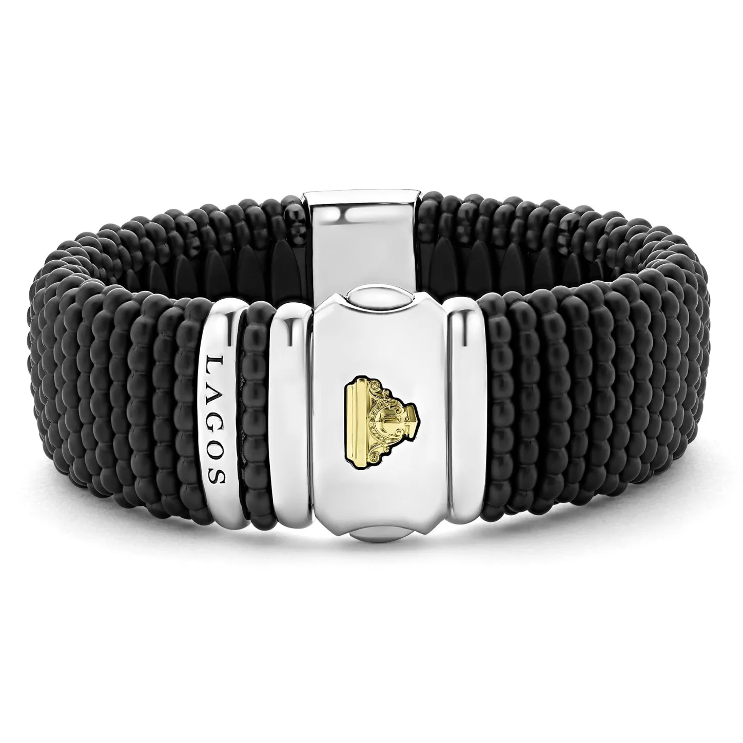 A Matte Black Ceramic Caviar Beaded Bracelet Accented By A Satin Finish 18K Gold Station Finished With A Double-Button Box Clasp.