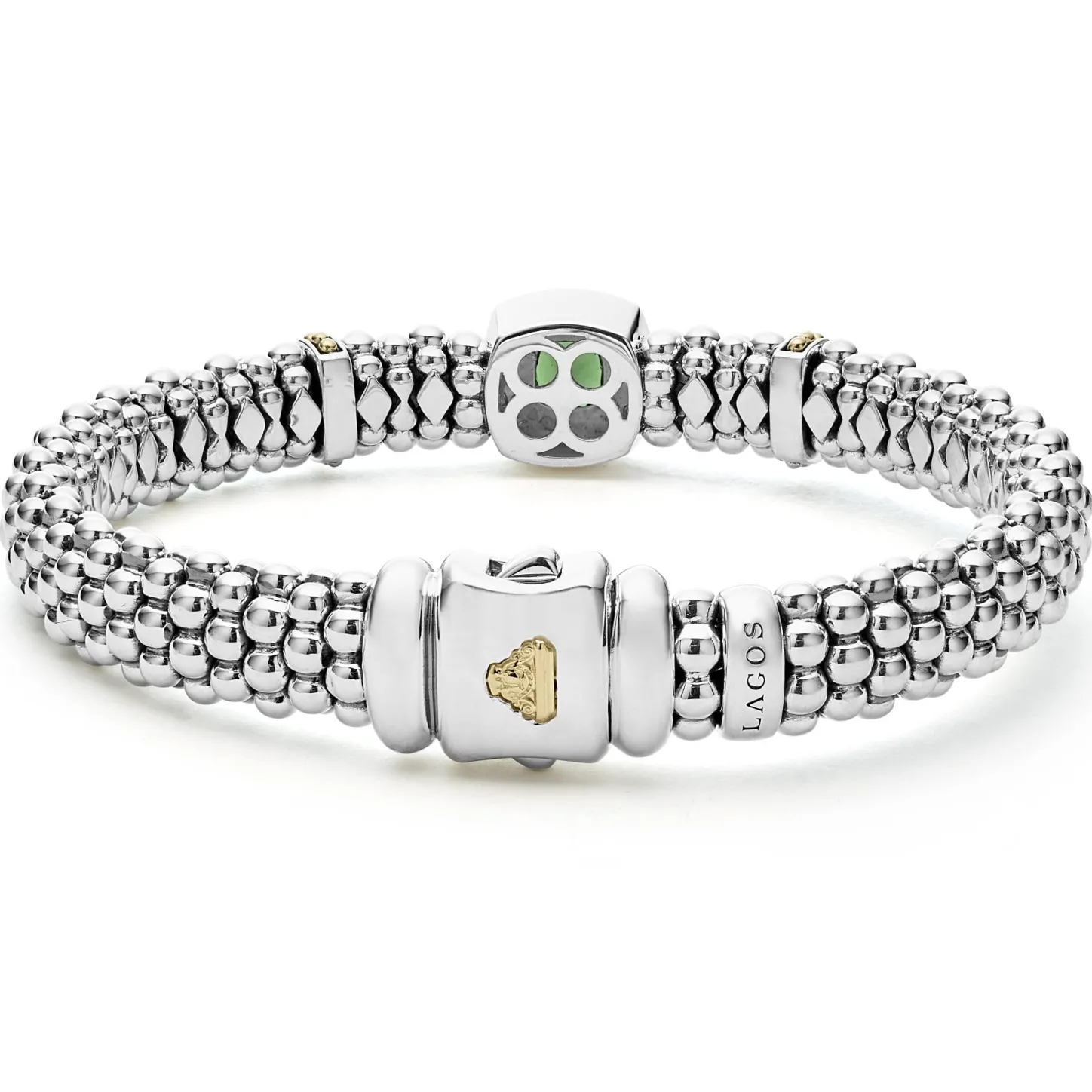 A Peridot Gemstone And Sterling Silver Caviar Beading With 18K Gold Detailing Forms This Bracelet.