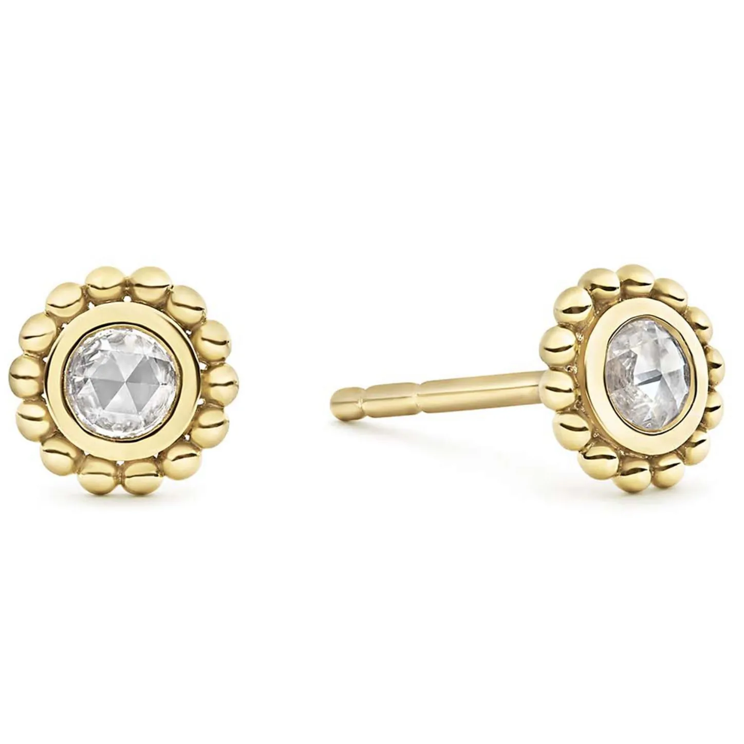 Rose Cut Diamond Stud Earrings Set And Surrounded By 18K Gold Caviar Beading. Lagos Diamonds Are The Highest Quality Natural Stones.