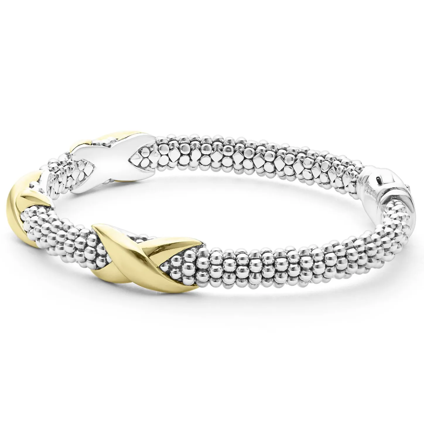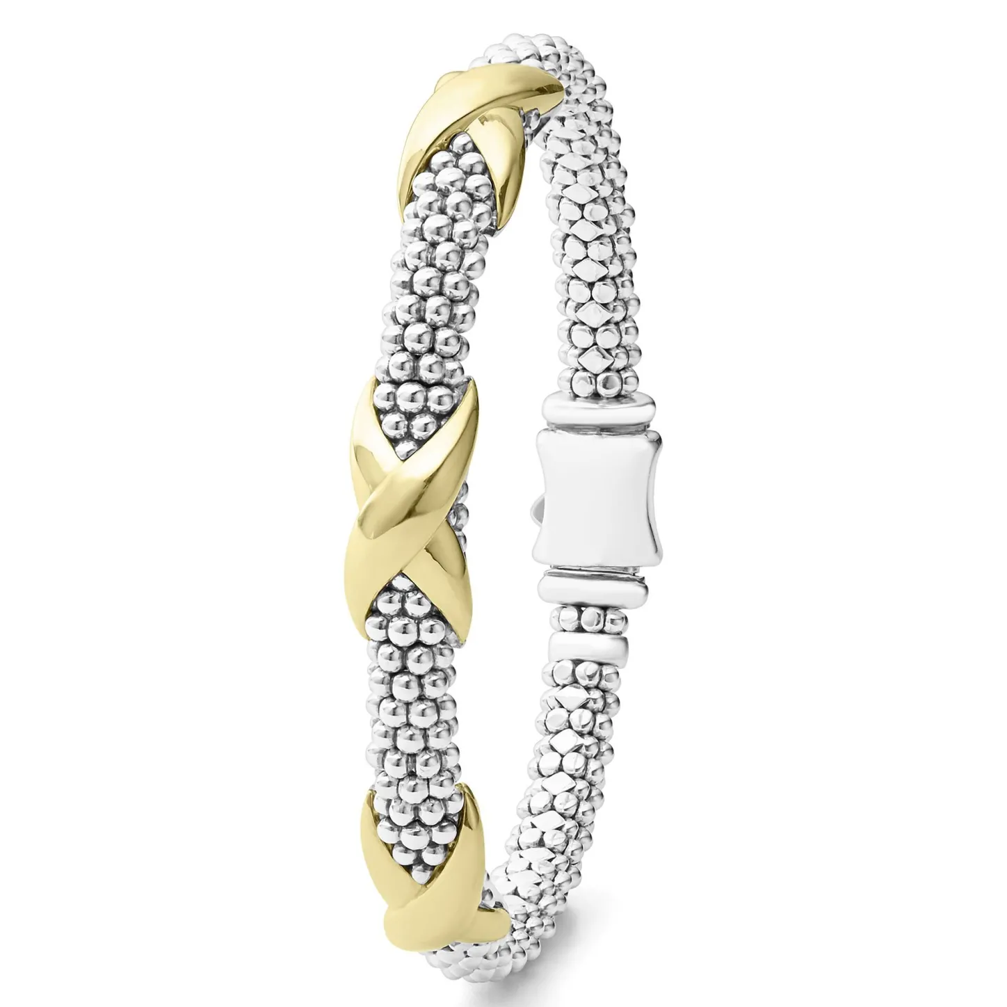 Sterling Silver Caviar Beading Accented By Three 18K Gold X Stations Form This Detailed Lagos Bracelet.