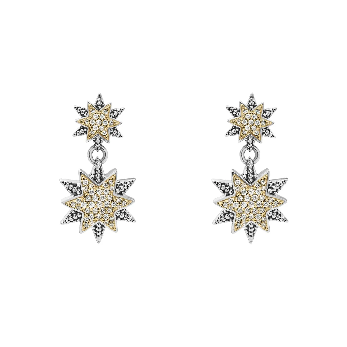 Diamonds, 18K Gold, And Sterling Silver Caviar Beading Form These Double Star Motif Drop Earrings. Lagos Diamonds Are The Highest Quality Natural Stones.
