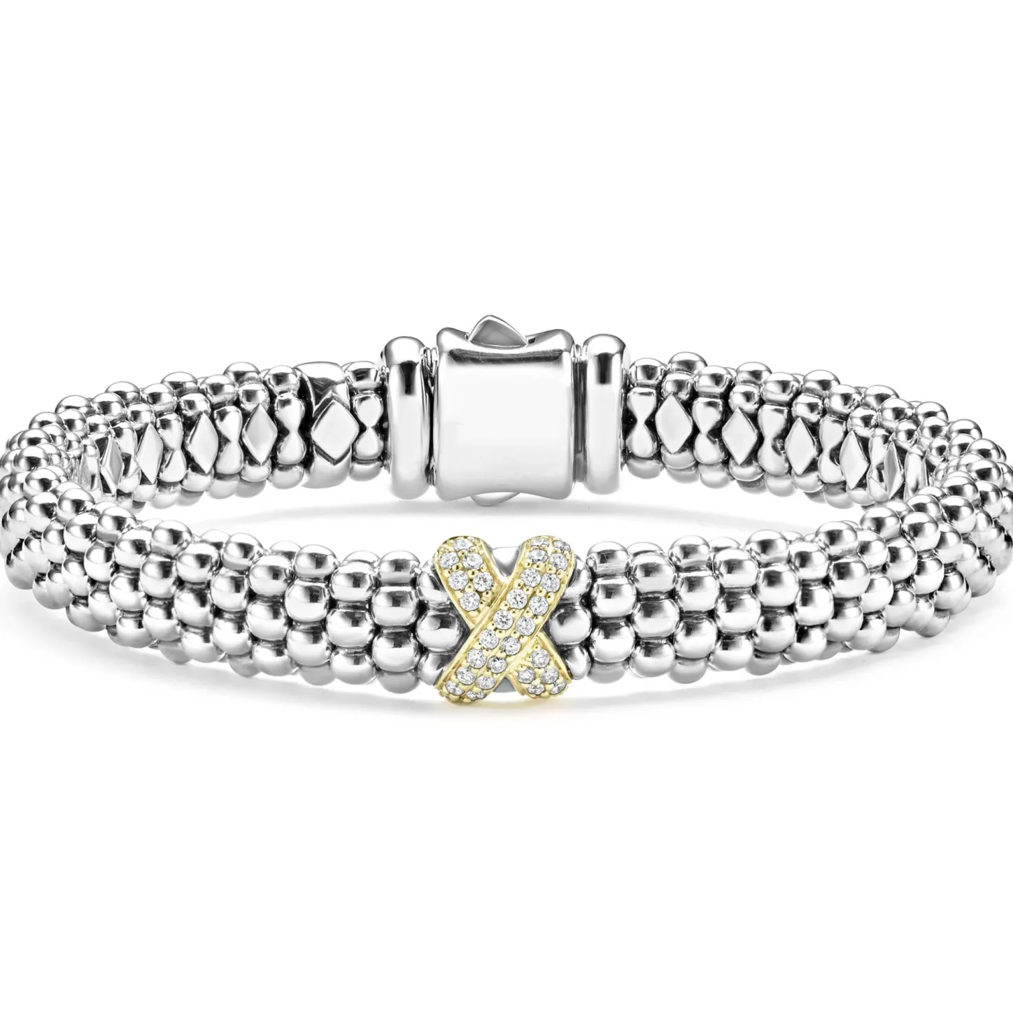 A Single Diamond X Station Set In 18K Gold Wraps This Signature Sterling Silver Caviar Beaded Bracelet. Lagos Diamonds Are The Highest Quality Natural Stones.