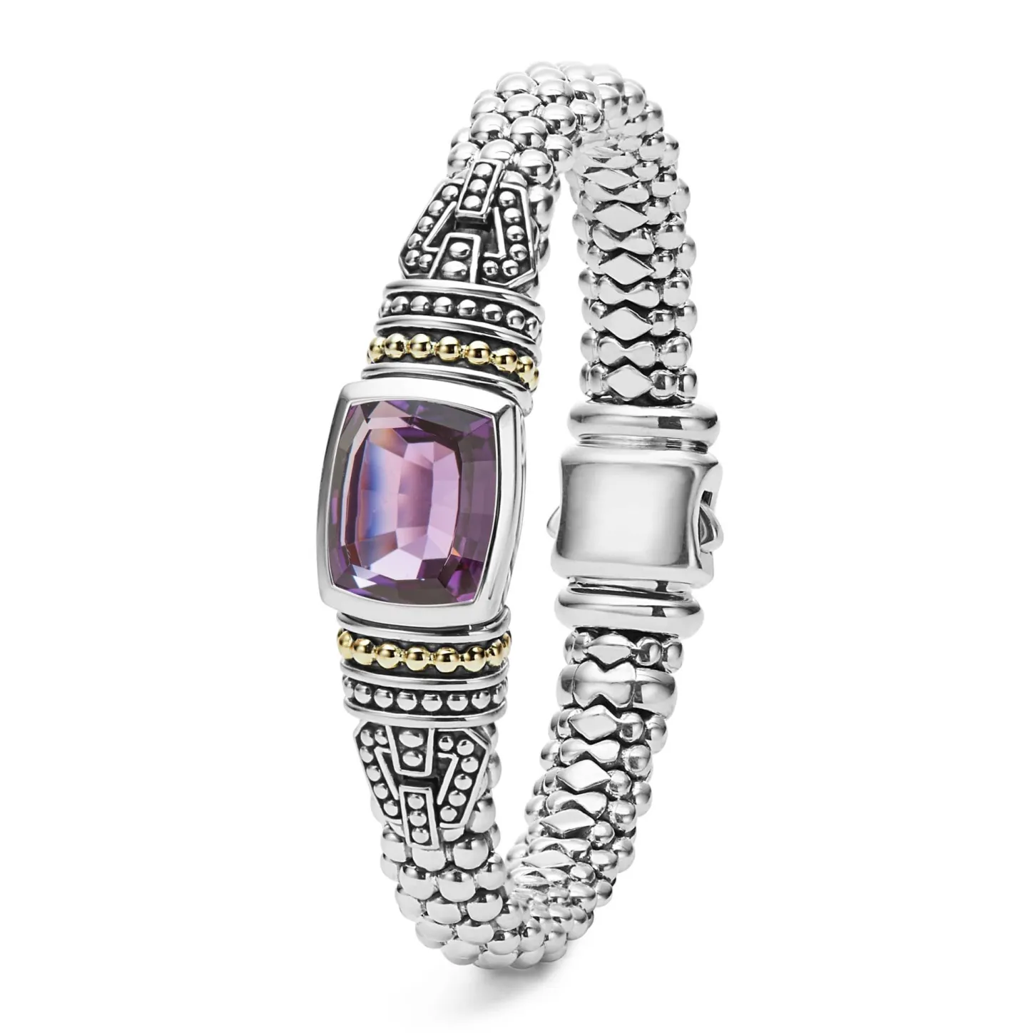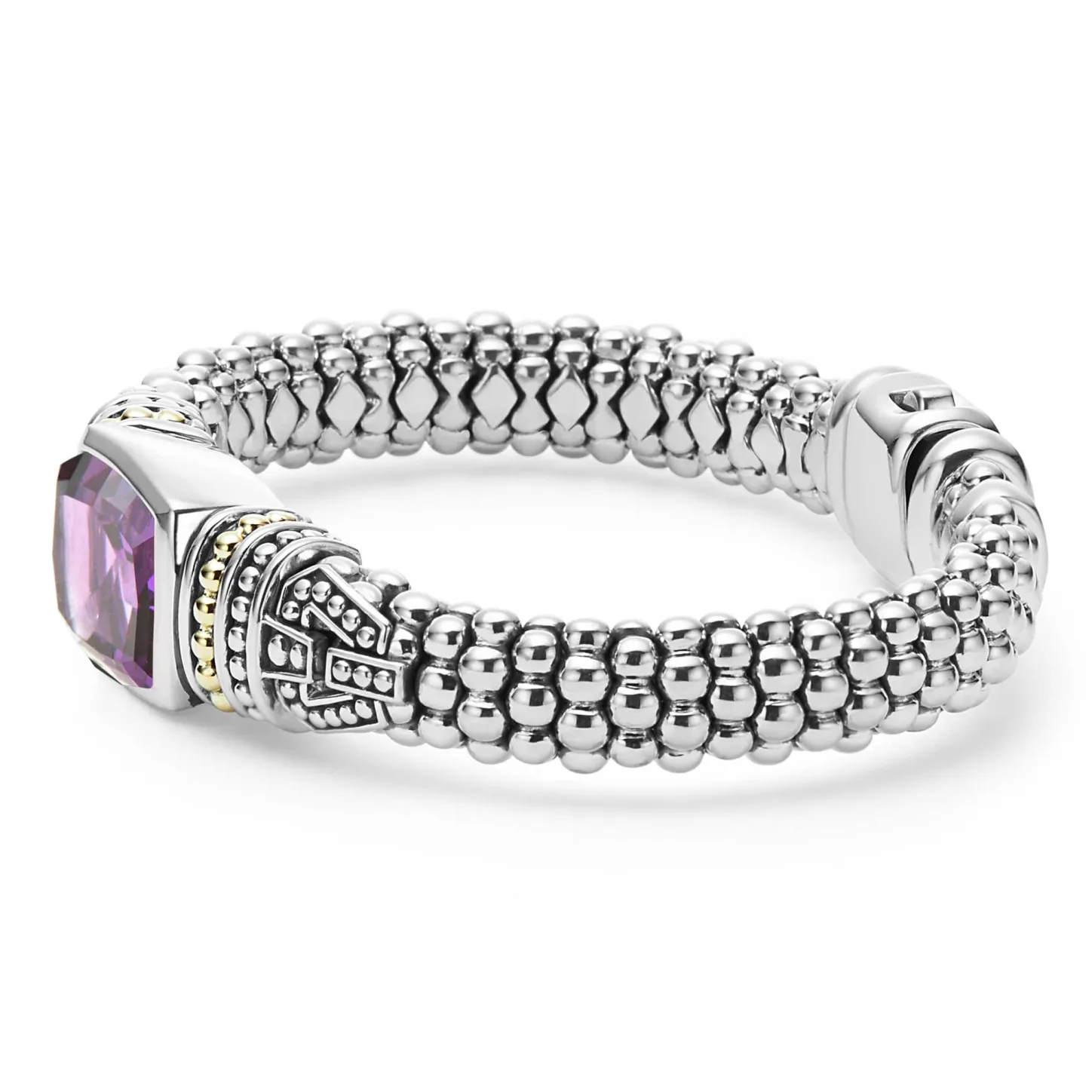 Amethyst Bezel-Set Gemstone And Sterling Silver Caviar Beading With 18K Gold Detailing Forms This Bracelet.