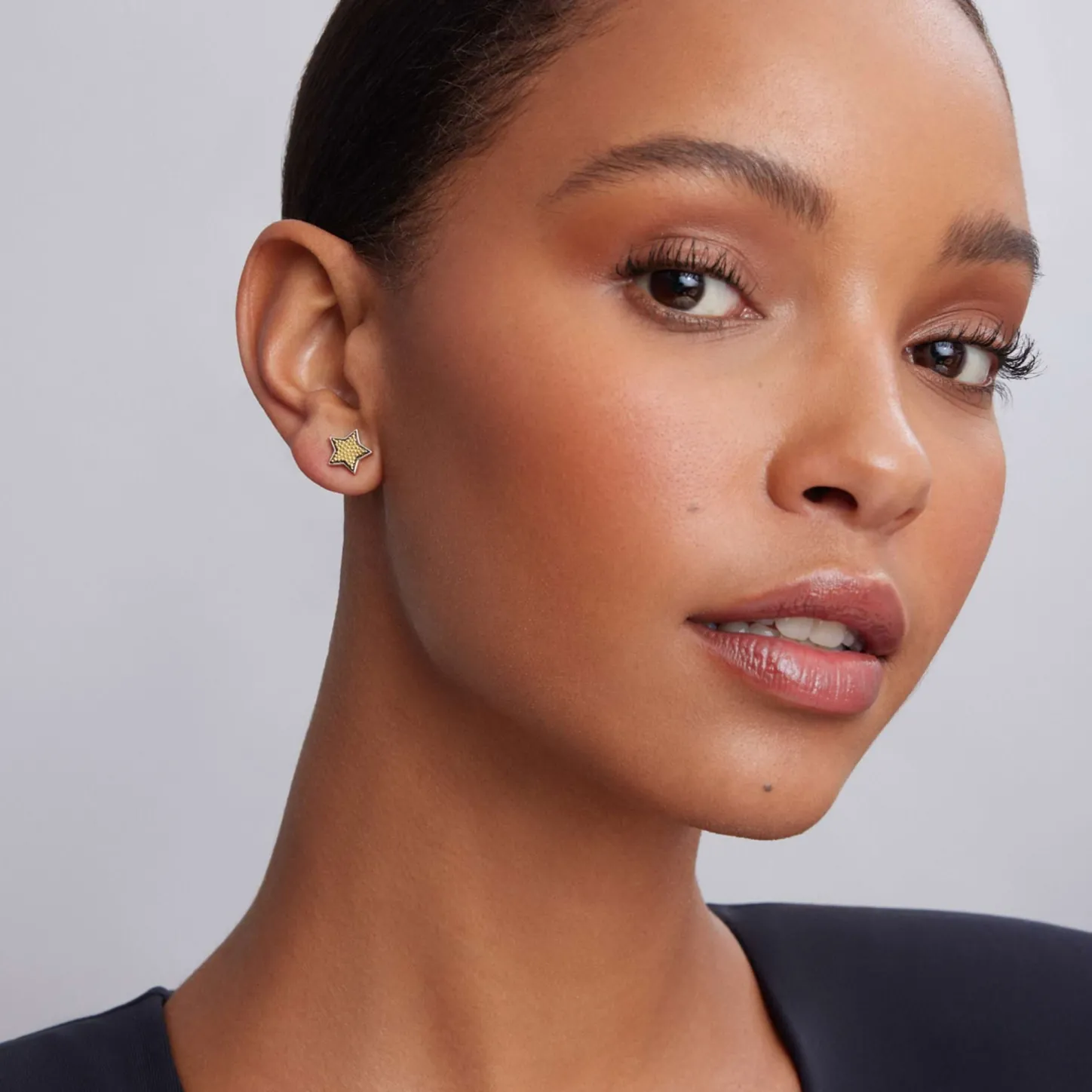 Sterling Silver And 18K Gold Caviar Beading Form These Moon And Star Earrings.