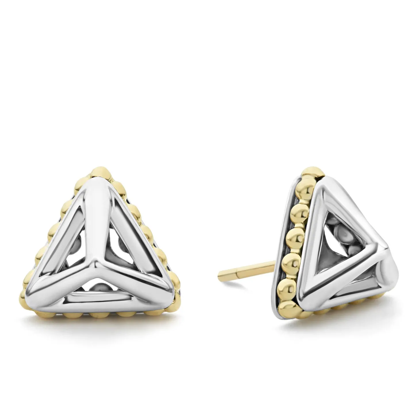 Sterling Silver Open Pyramid Stud Earrings With 18K Gold Caviar Beaded Accents.